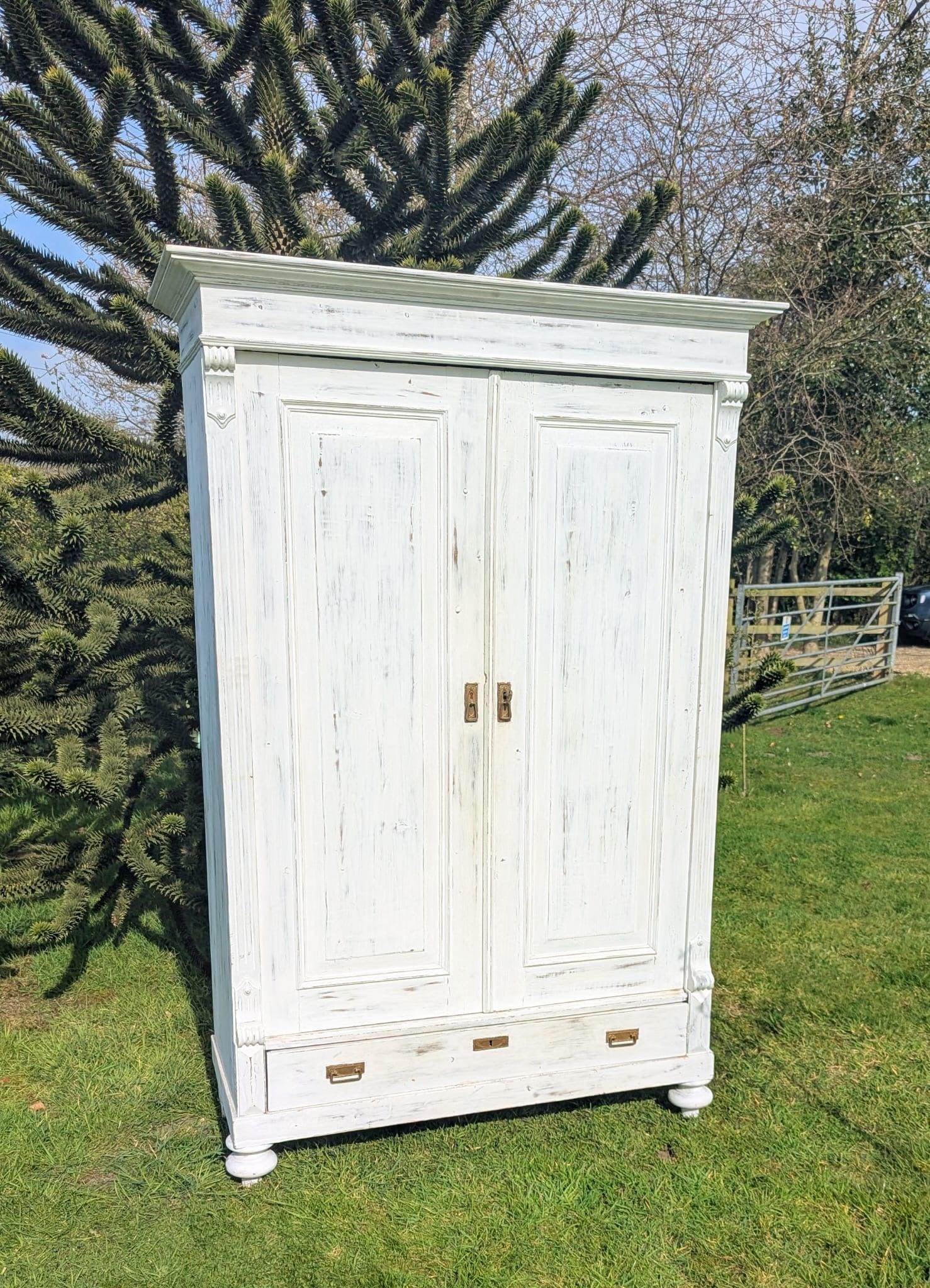 This beautiful French housekeeper cupboard is a wonderful addition to any antique furniture collection. Crafted from high-quality pine wood, this cupboard features six adjustable shelves, two drawers, and two right-handed doors with shaker style. The exterior of the cupboard has lovely carvings and an aged metal handle finish, giving it a unique and charming look. This cupboard comes with a key and is lockable. It has a white painted finish and is freestanding. The exterior dimensions are 137cm x 43 cm x 205cm (W x D x H). This cupboard is handmade and was manufactured in France in the 1890s. It is an original piece, the top and door come off for easier lifting and transportation. Top Width: 137 cm Side Width: 123 cm Height: 205 cm Depth: 43 cm All minor restoration is done sympathetically to keep authenticity. With all furniture of this age it's consistent, showing signs of wear and tear, these add to its charm and character. You may find these under our seal and paint, this is absolutely what you should expect when buying genuine vintage items.