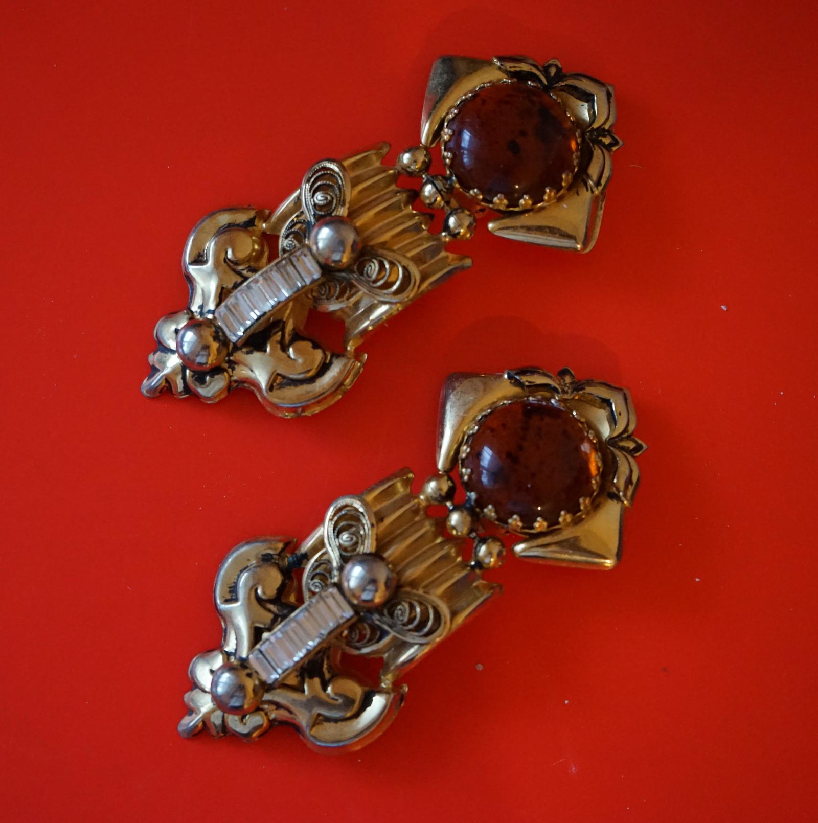 Vintage Large Gilt Gem Set Ornate Clip Earrings