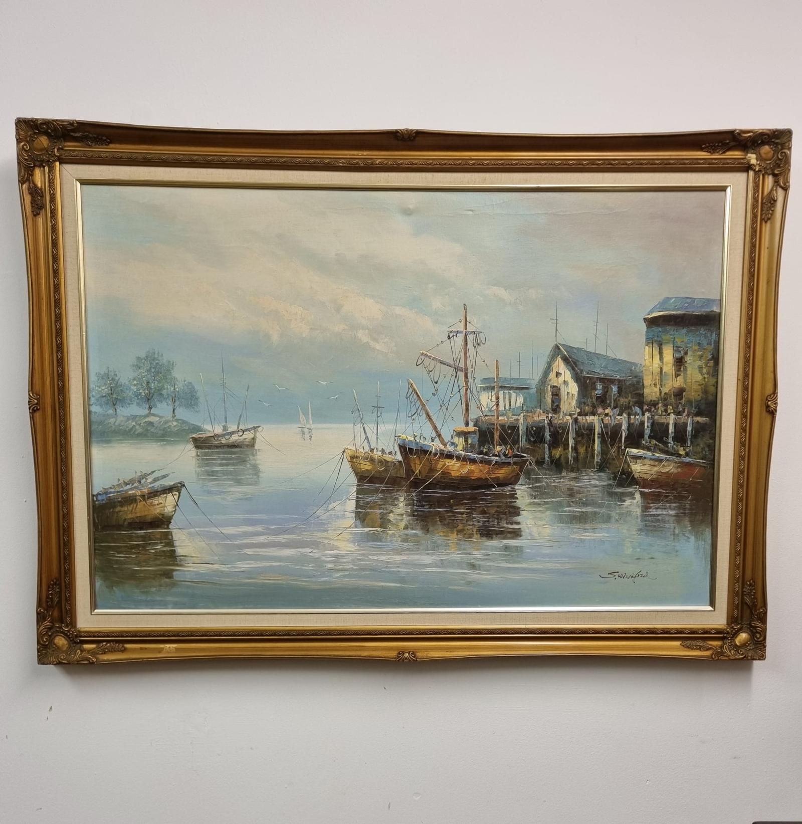 A striking and generously sized oil on canvas seascape depicting moored fishing boats in a calm harbour setting, executed with lively brushwork and rich coastal colour. The piece is signed “S. Winifred” to the lower right and presented in a decorative gilt frame with linen slip ready to hang and display.