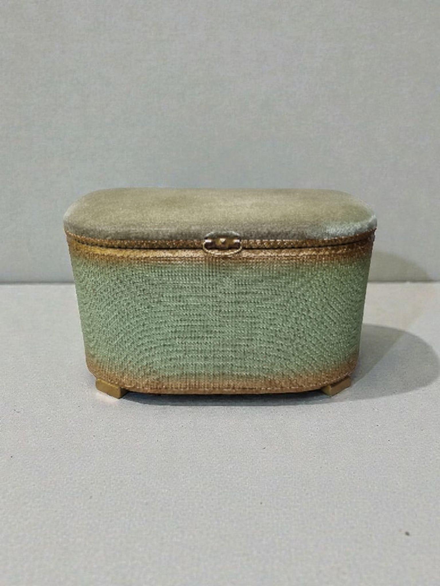 This classic piece features the signature woven paper-cord body in a soft sage green tone, complemented by a matching cushioned lid and original braided trim.