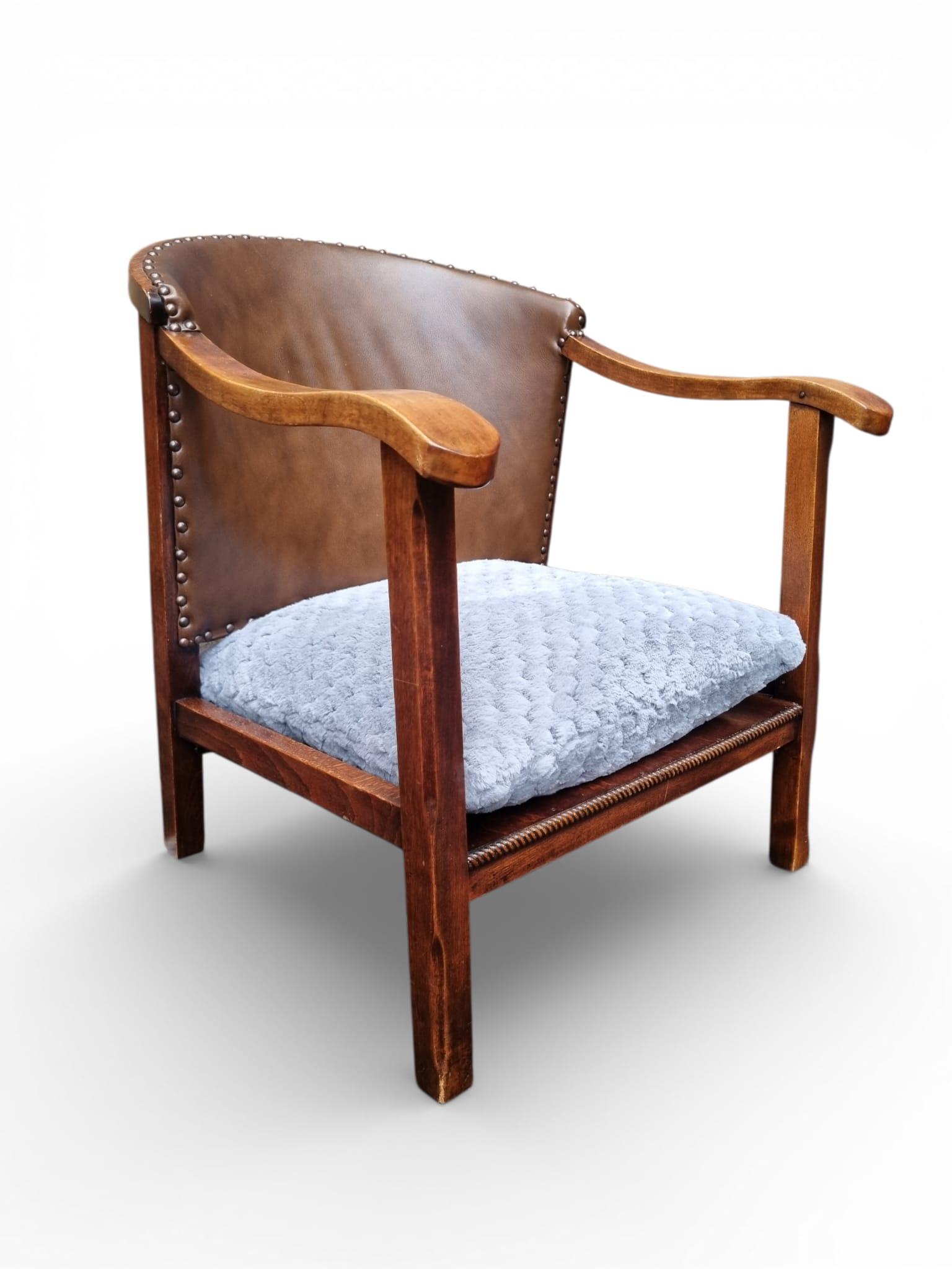A charming low vintage armchair with a solid wooden frame and gently curved armrests, offering a comfortable and relaxed seating position. The chair features a shaped back panel with decorative stud detailing and a generously padded seat cushion upholstered in a soft blue fabric.