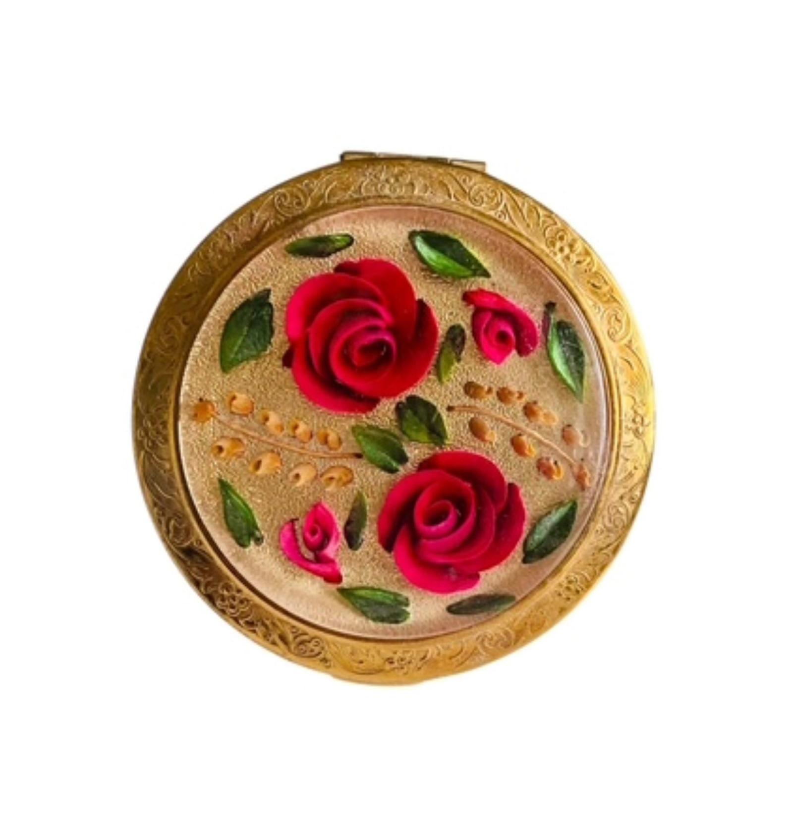 Vintage Melissa powder compact dating circa 1950, measuring 7 cm in diameter and made of gold tone metal with decorative machine turned pattern to the base. The lid has chased gold tone border and at the centre of the lid set within clear Lucite dome with faceted edges are delightful lucite roses and foliage on a gold glitter foil ground. This powder compact has firm hinge and secure catch and opens to reveal a clear and reflective framed glass mirror under the lid. The case is marked on the frame beneath the mirror Melissa Made in England. The powder well in the base is covered by a hinged powder well door which opens and closes correctly. The powder well has traces of loose powder and retains the original sifter. Offered in very good condition with just some marks to the base consistent with placing over the years. Nothing further is found.