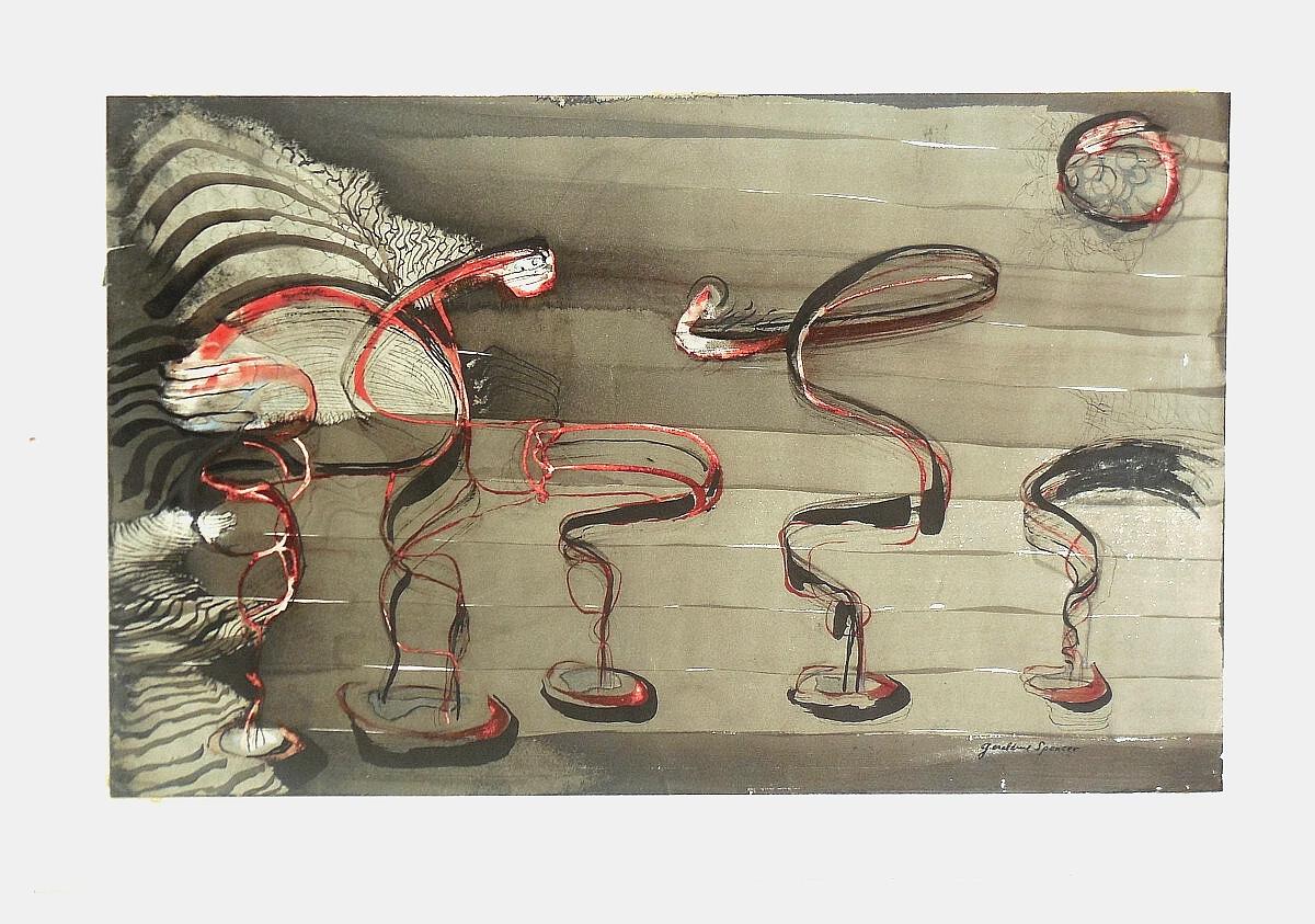 For sale is this exciting School of Surrealism painting of 5 dancers on a stage or landscape setting. It is a watercolour and gouache on paper and is signed lower right, Geraldine Spencer. I would estimate it was painted some time in the 1960s. The image measures about 12 inches by 20 inches and is mounted on board which increases the se measurements by about 1 inch on each margin. It weighs a total of about 206 grams. It is in very good condition with no tears or holes. Minor wear around the margins. Please refer to photos and feel free to ask questions; I usually get back to you quickly! Shipping will be free within the UK. There is a reasonable shipping charge for foreign buyers, but I will consolidate multiple items for one low price. The items I sell are fully guaranteed to be as I have described them. I often go on buying trips in the U.K. and to France so keep checking my page. I happily accept returns if you are dissatisfied with an item.