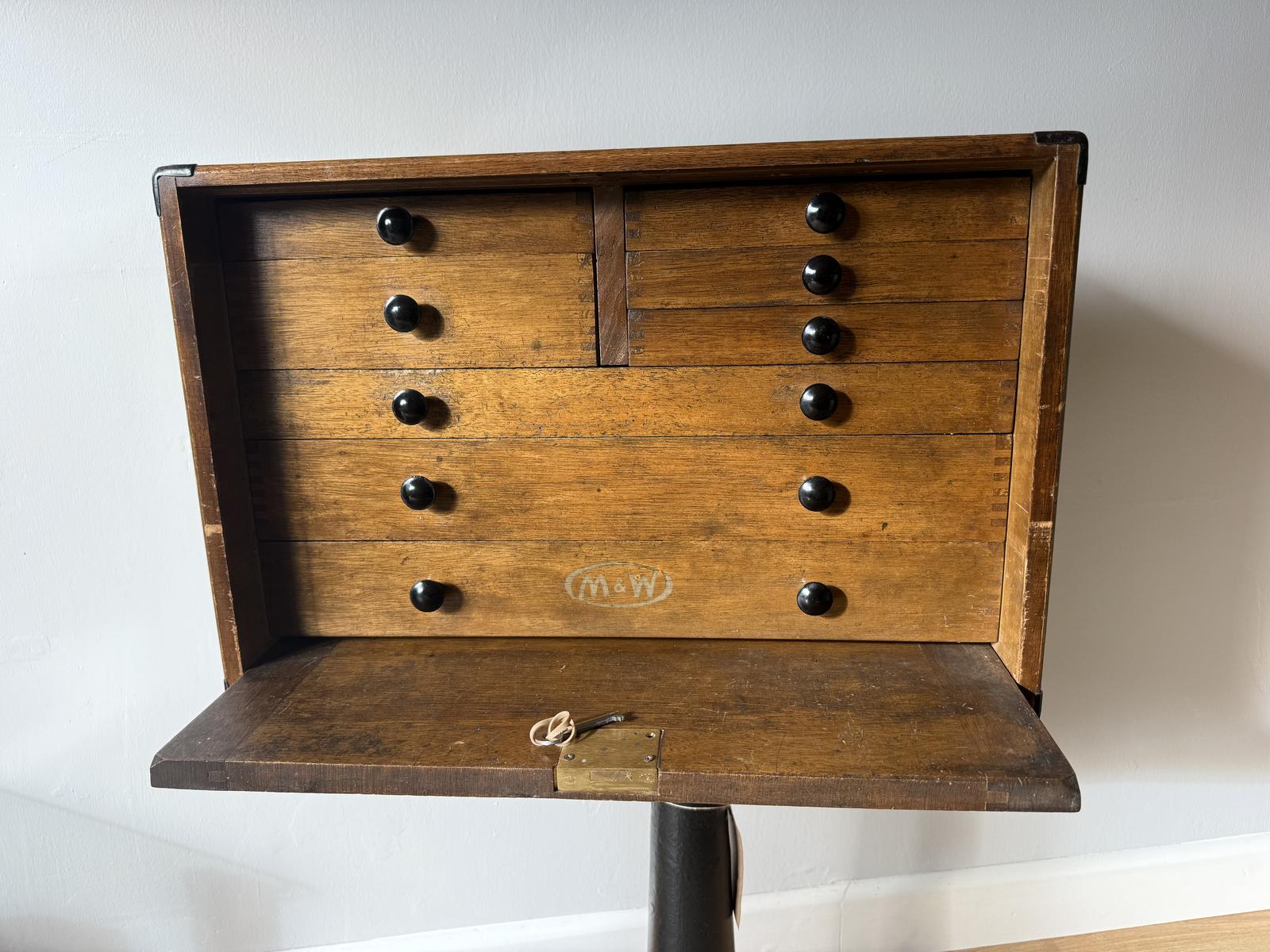 This vintage Moore and Wright tool cabinet/chest is a storage unit designed for tools and equipment. It is constructed from wood and features a series of compartments and drawers for organisation. The piece dates approximately 1960s, reflecting the craftsmanship of that era. The cabinet is marked with the Moore and Wright brand, known for precision tools. Its functional design and vintage appeal make it suitable for both practical use and display.