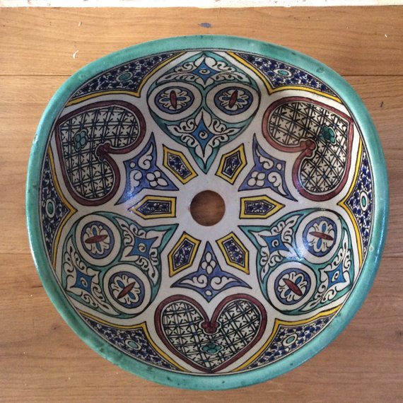 Vintage Moroccan Handmade & Painted Pottery Ceramic Basin Bathroom Sink Ex Riad 35cm Wide