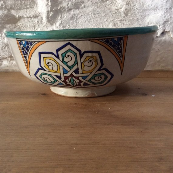 Vintage Moroccan Handmade & Painted Pottery Ceramic Basin Bathroom Sink Ex Riad 35cm Wide