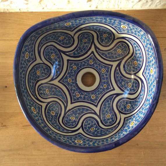 Vintage Moroccan Handmade & Painted Pottery Ceramic Basin Bathroom Sink Ex Riad 35cm Wide