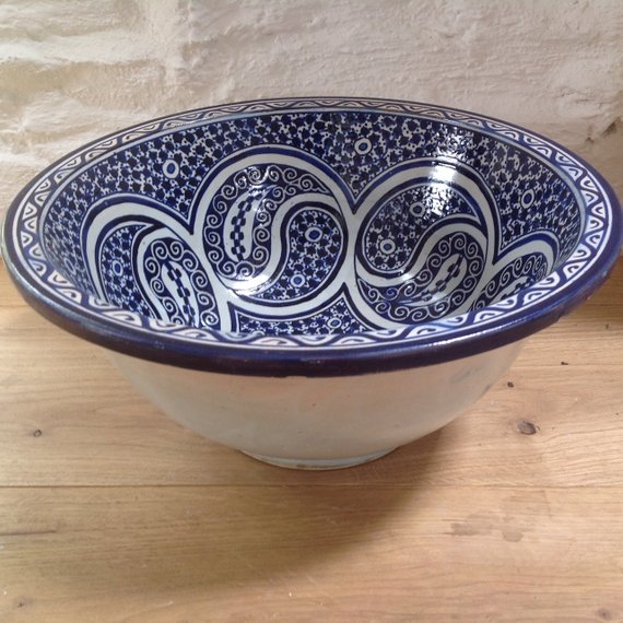 Vintage Moroccan Handmade & Painted Pottery Ceramic Basin Bathroom Sink Ex Riad 35cm Wide