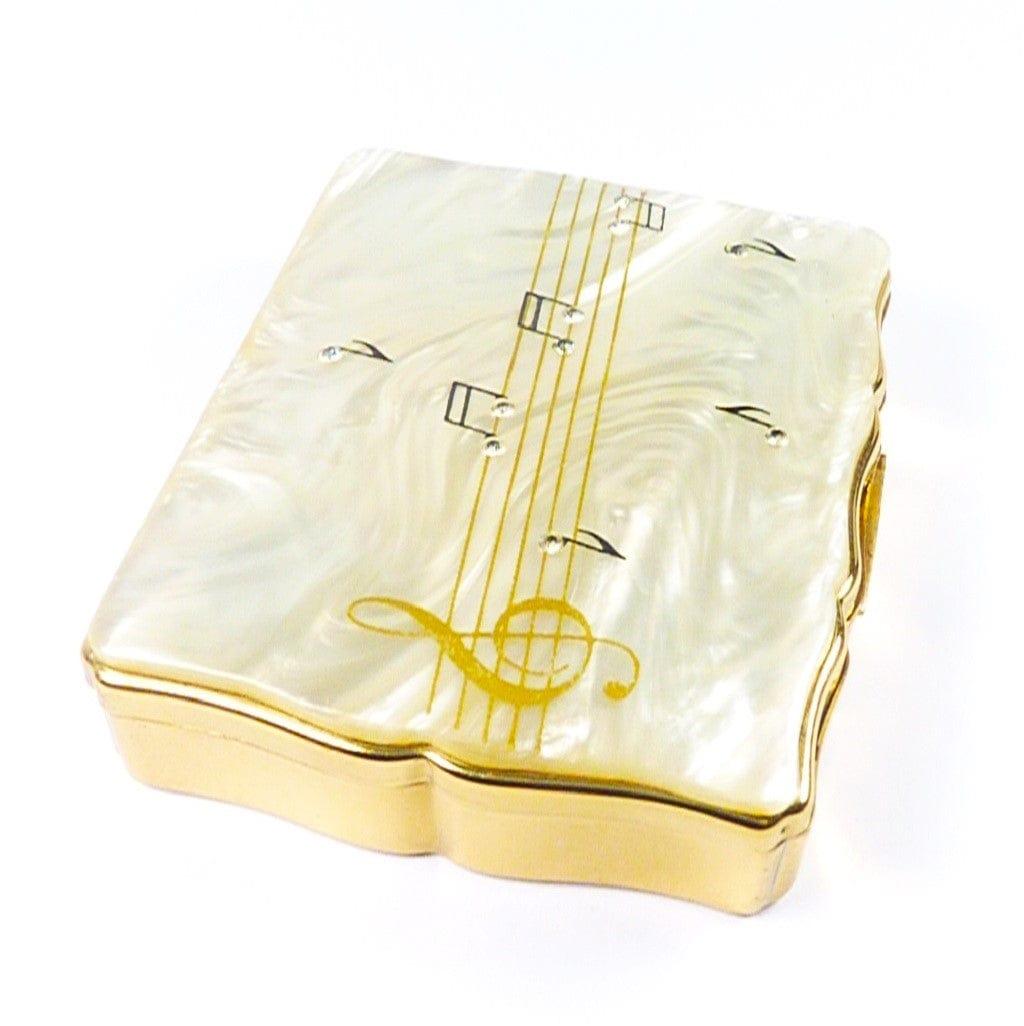 The lid is decorated with a musical score which includes rhinestone set musical notes on a background of high quality Lucite.