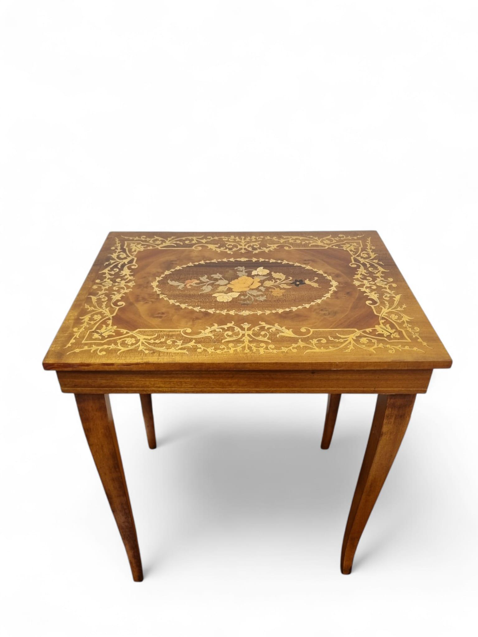 An elegant vintage musical side table featuring a beautifully hand-inlaid wooden top with floral and foliate marquetry.