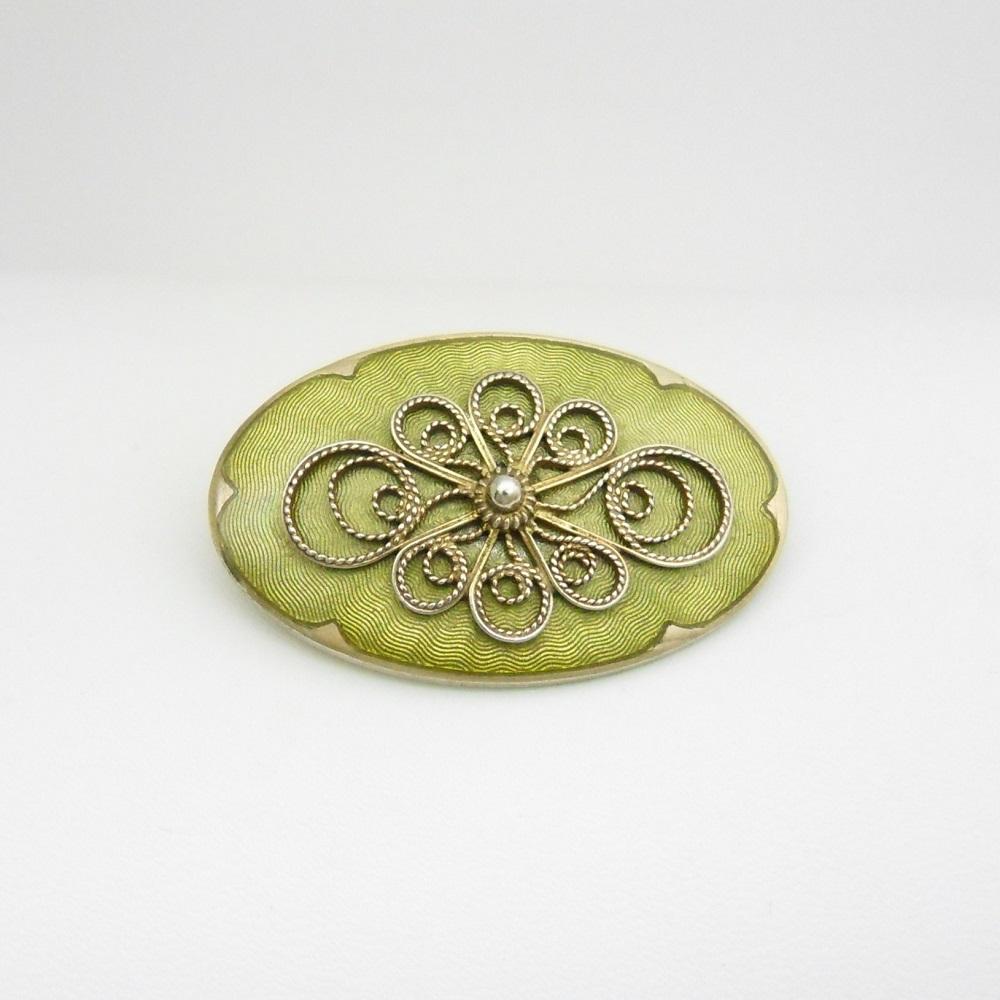 Vintage Norwegian Silver & Green Enamel Filigree Brooch