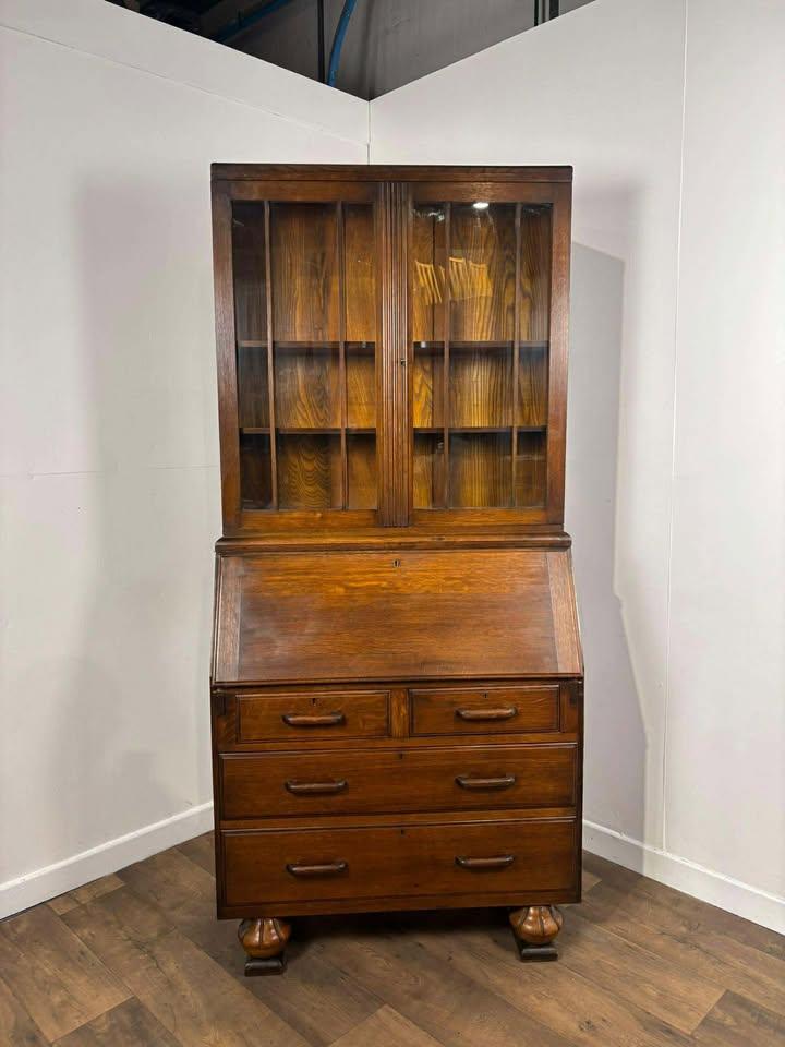 A well-proportioned oak bureau bookcase, combining practical storage with classic styling. The piece is constructed in two sections, allowing it to split for ease of movement and transportation.