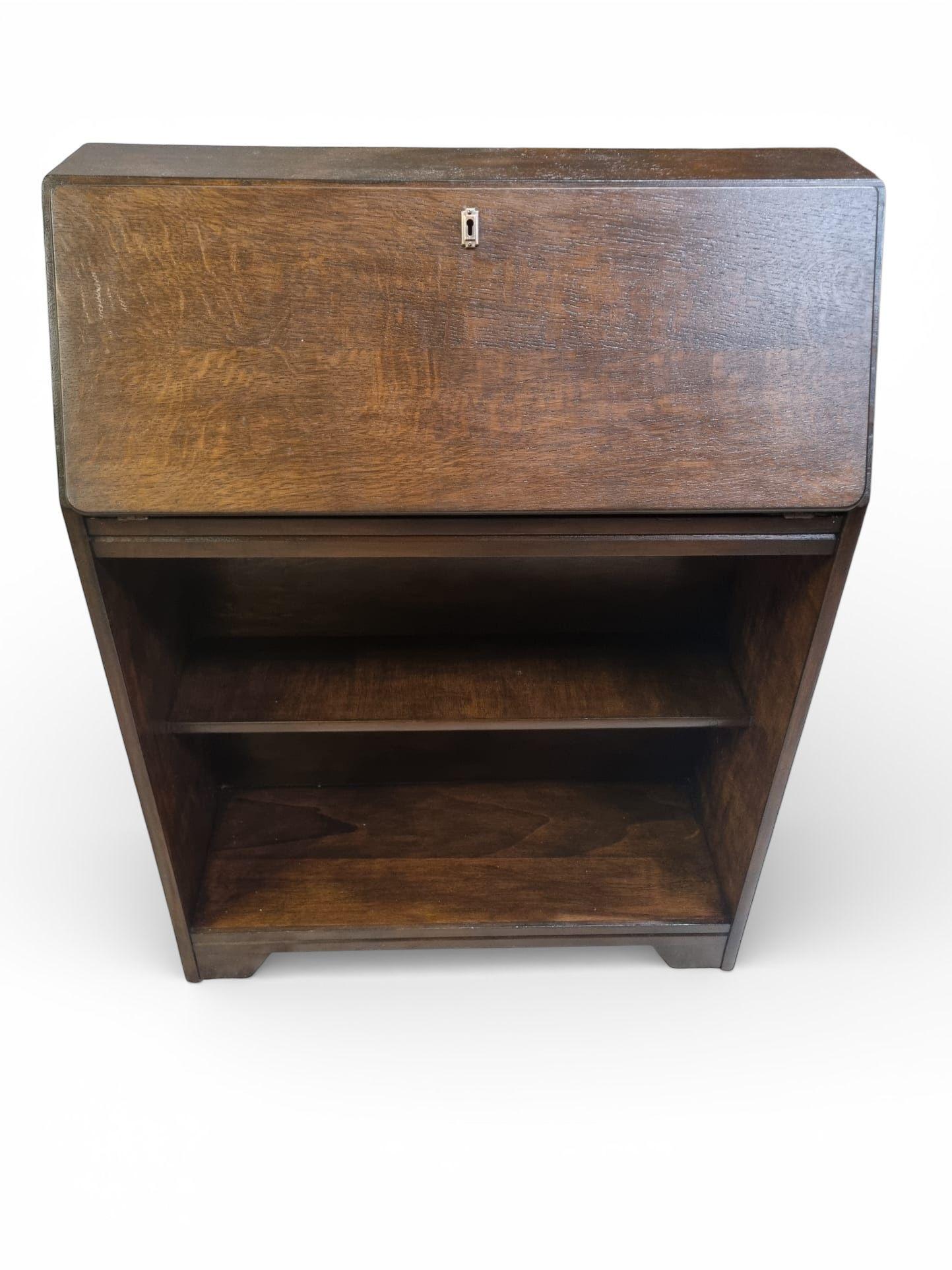 A charming mid 20th century oak bureau bookcase, combining a fall front writing desk with practical open shelving below.