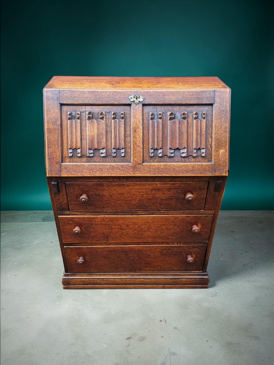 A beautiful vintage oak bureau writing desk, crafted from solid oak and finished in a warm traditional tone.