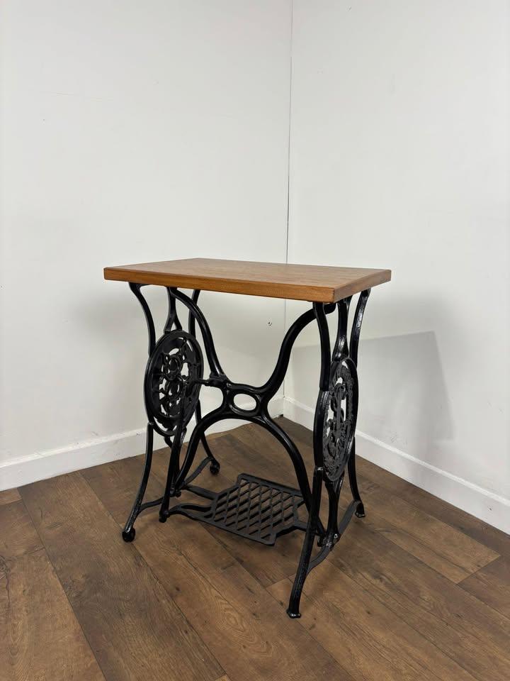 A striking and characterful vintage centre table featuring a solid oak rectangular top set on an original cast iron treadle sewing-machine base. A wonderful industrial-style piece that blends vintage charm with practical everyday use.