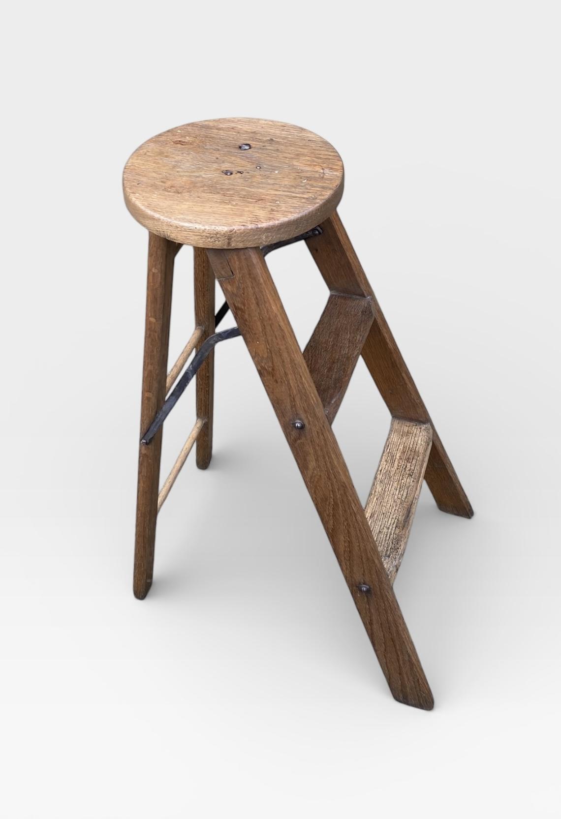 Design: Features a folding mechanism with original blackened iron hinges. The circular top serves as a comfortable seat, while two wide, sturdy treads provide easy access to high shelves or cabinets.