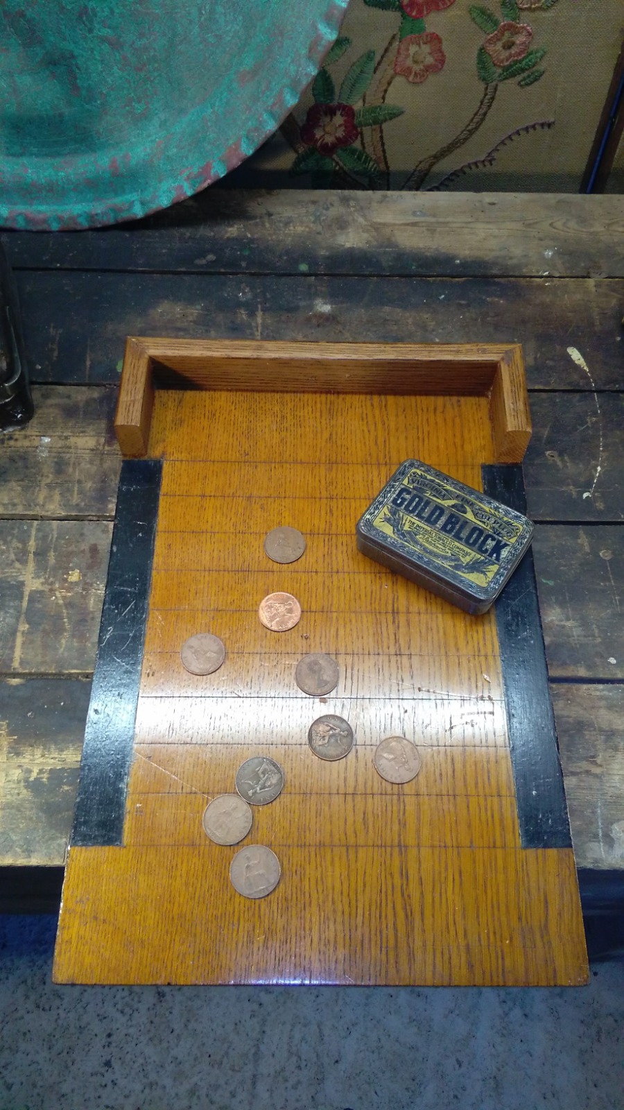 Vintage Oak Shove'ha'penny Board with Old Tobacco Tin of Old Pennies