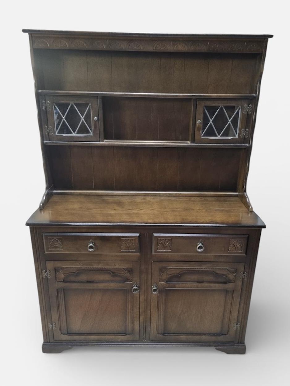 The warm oak tone, traditional carving details, and original style fittings make this a timeless and versatile piece, suitable for a dining room, kitchen, or living space.
