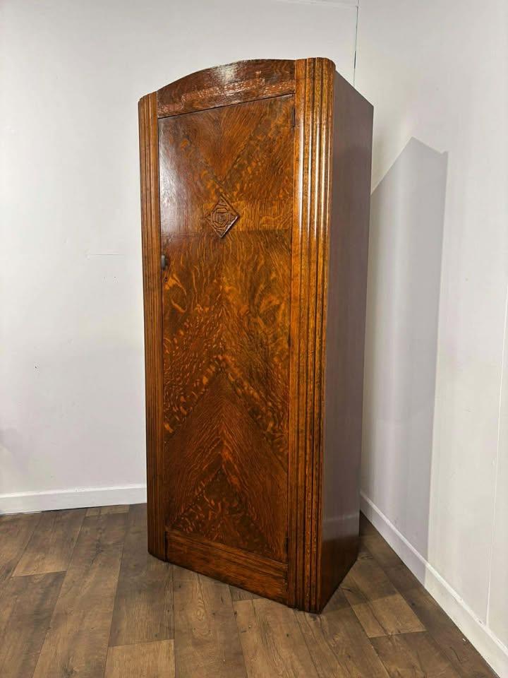 A charming vintage oak veneer single door wardrobe, ideal for use as a hall robe, compact bedroom wardrobe, or occasional storage piece. The proportions make it particularly useful where space is at a premium, while still offering excellent internal storage.