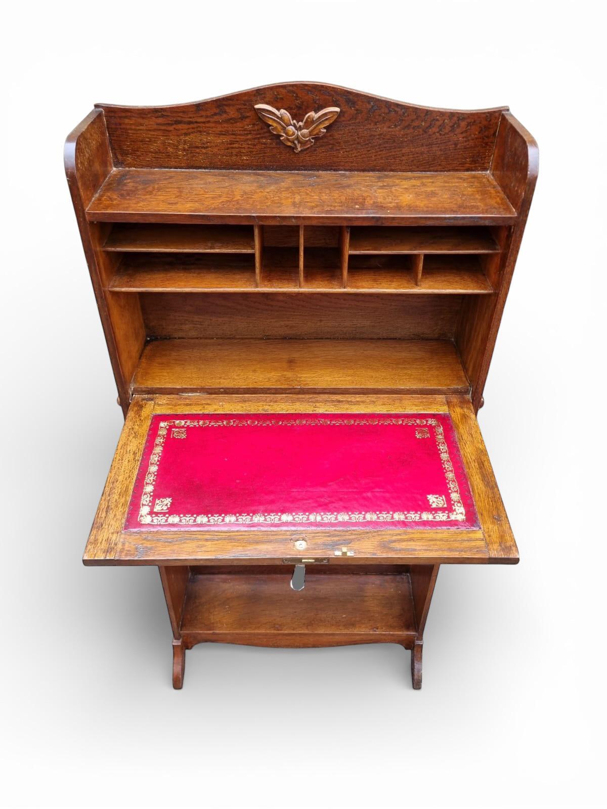 The bureau opens to reveal a charming interior fitted with multiple pigeonholes and compartments, perfect for organising letters, documents, or stationery.