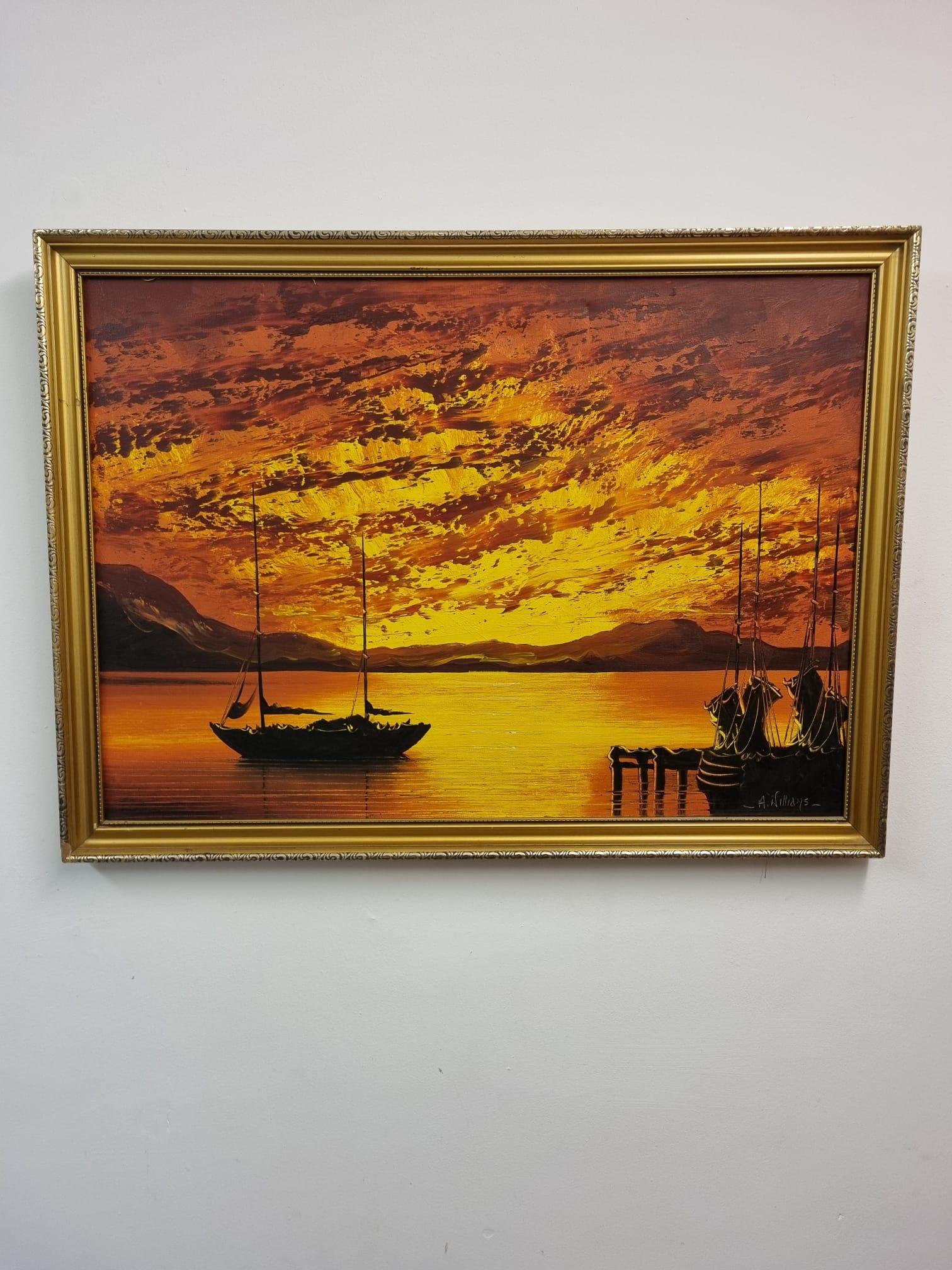 A striking vintage oil painting on canvas, depicting a dramatic sunset harbour scene with sailing boats, rendered in rich golden and deep amber tones.