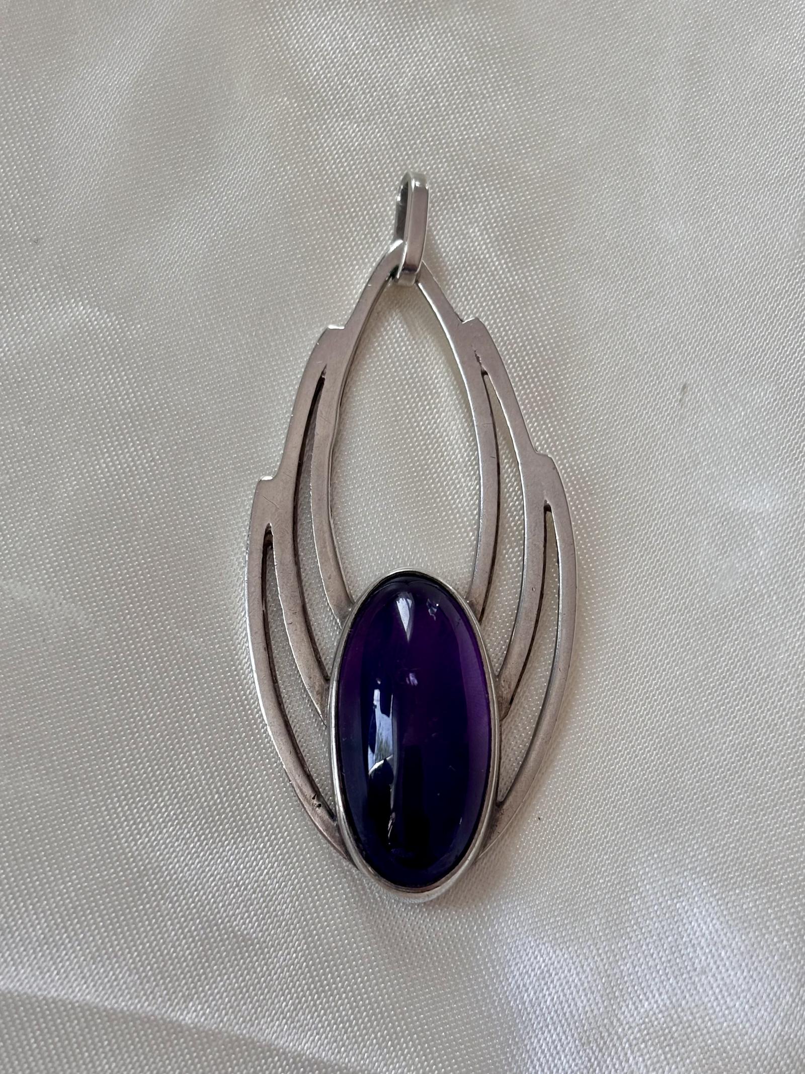 A good example of a vintage silver feather shaped pendant with a large cabochon amethyst. Stamped OMG hallmarked Edinburgh 1976. Please see all photos for details related to wear and age. Length including bale is 5.5 cms