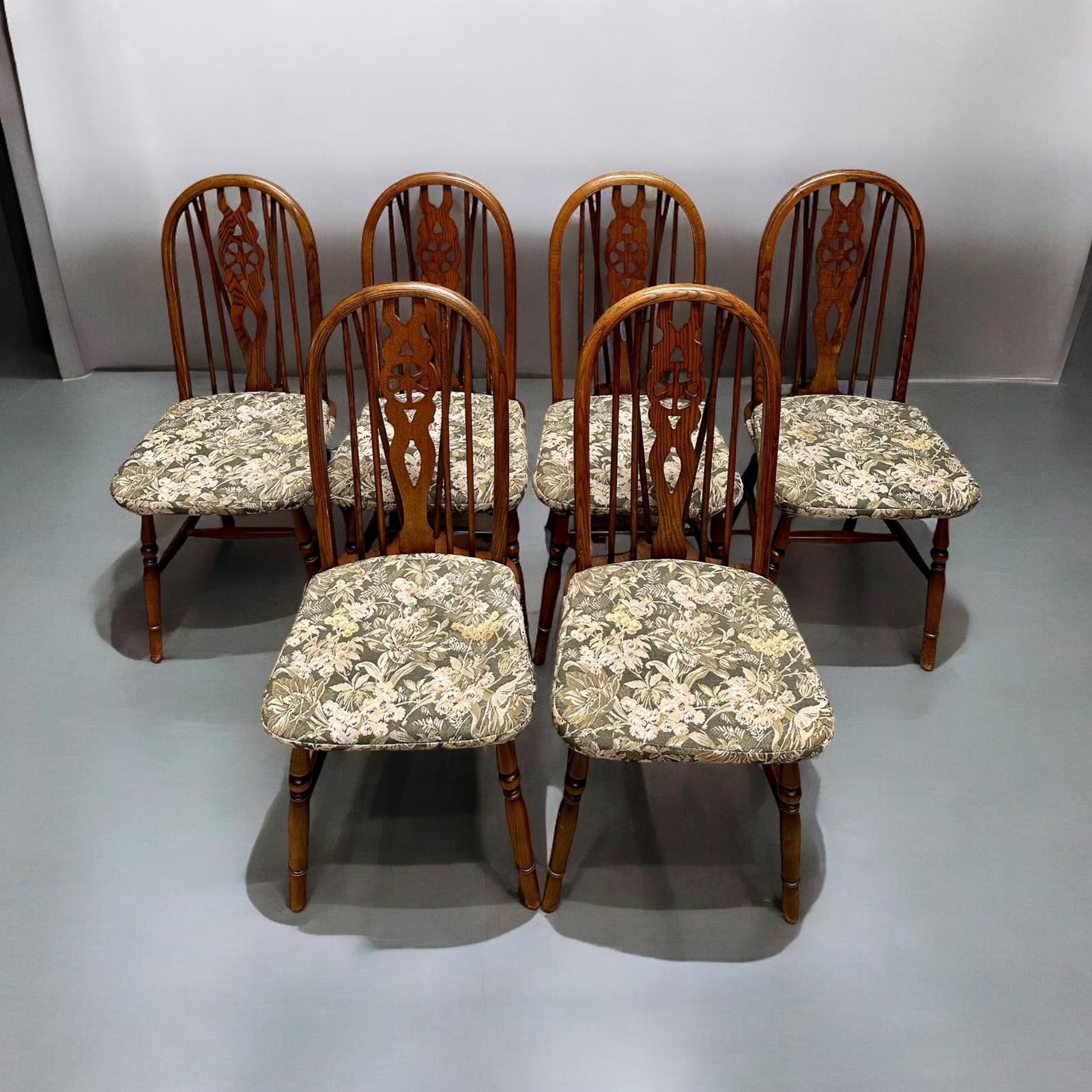 Vintage Old Charm Dining Wheelback Kitchen Windsor Chairs c.1970 / Original Seat Cover / Set of 6