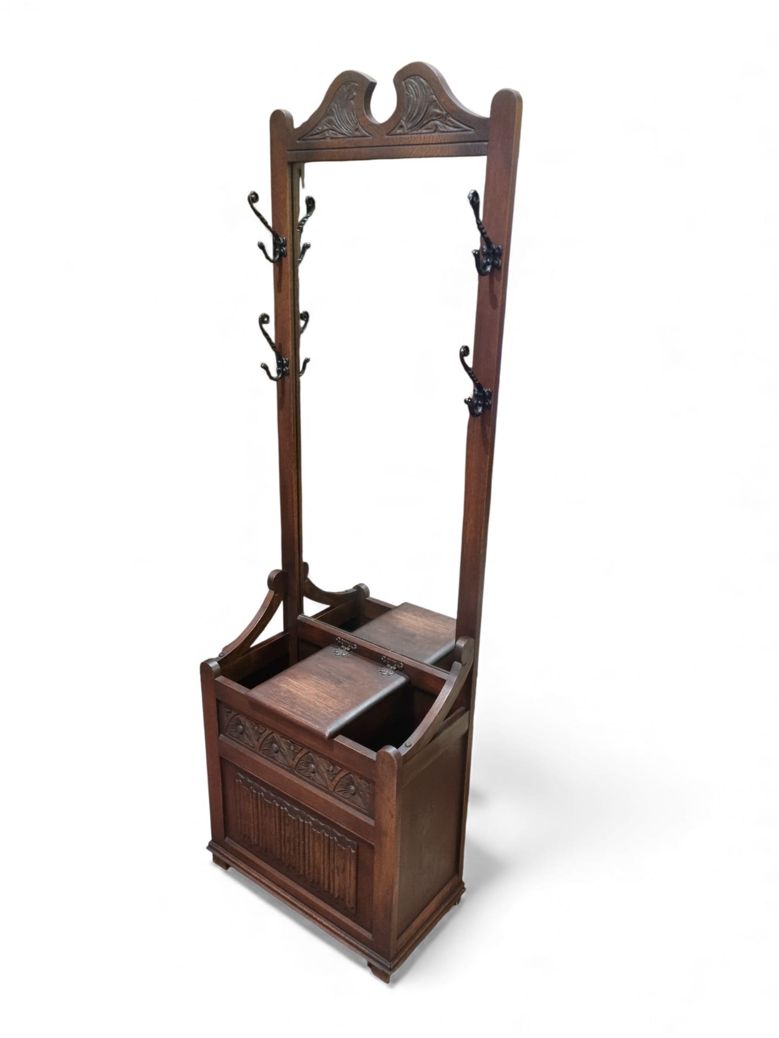 A handsome vintage oak hall stand by Old Charm Wood Bros, crafted in solid oak and showcasing the brand’s well-known Tudor Revival character.