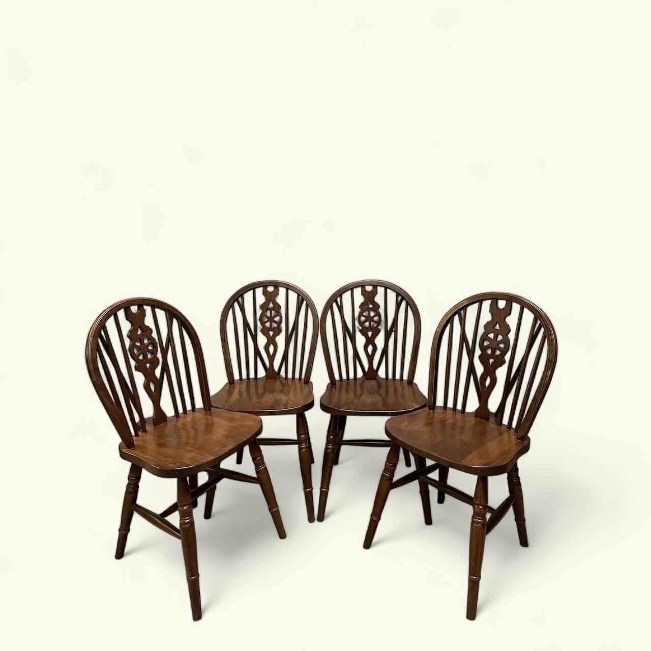 Vintage Old Charm Style Dining Wheelback Kitchen Windsor Chairs / Set Of 4 / Dark Brown Oak c.1950