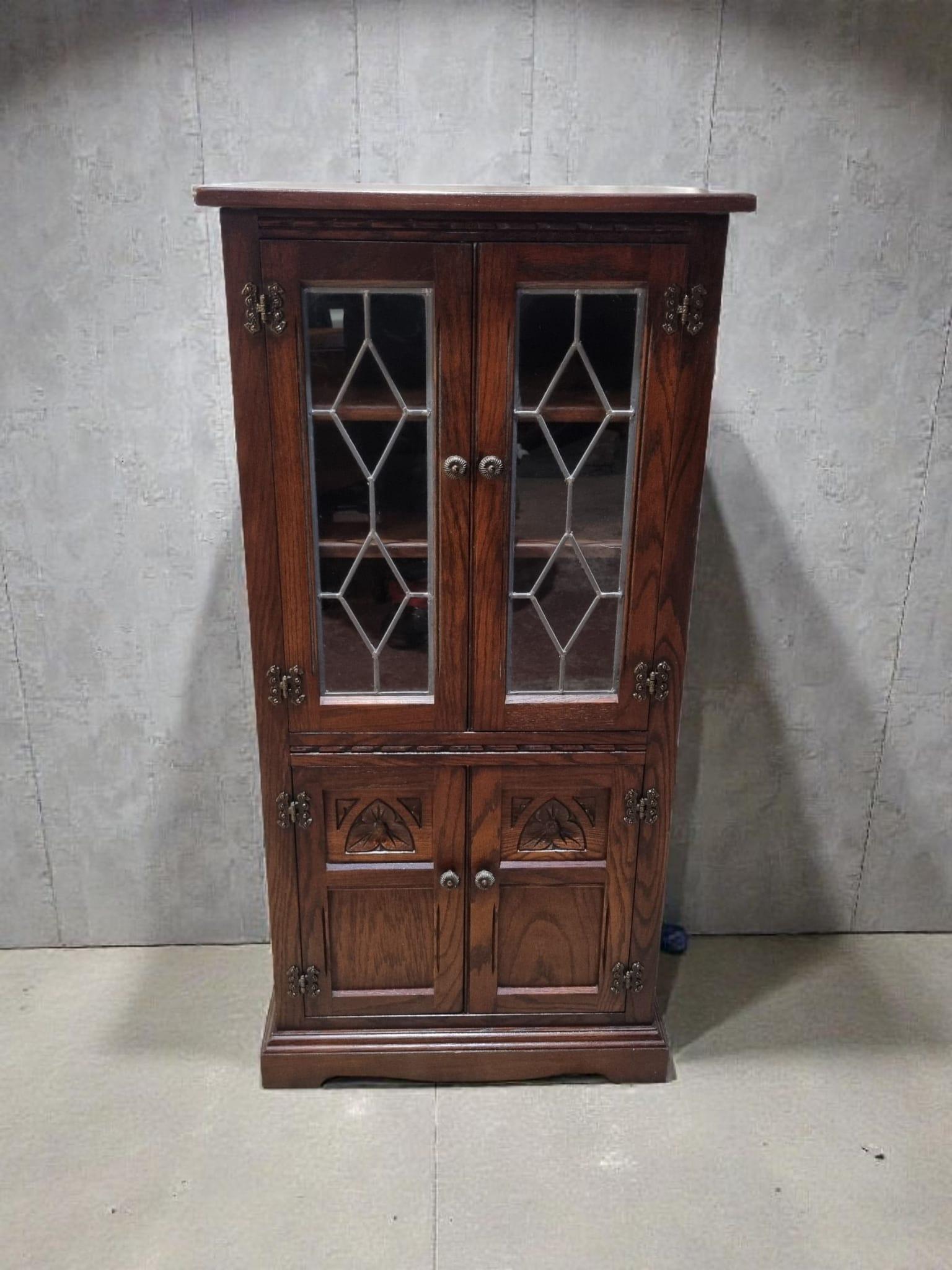 MebleinUK has clarified that the Vintage Old Charm Wood Bros Hi-fi Cabinet / c.1970 / Tudor Brown / Leaded Glass (LA557795) is genuinely of the period declared with the date/period of manufacture being c.1970