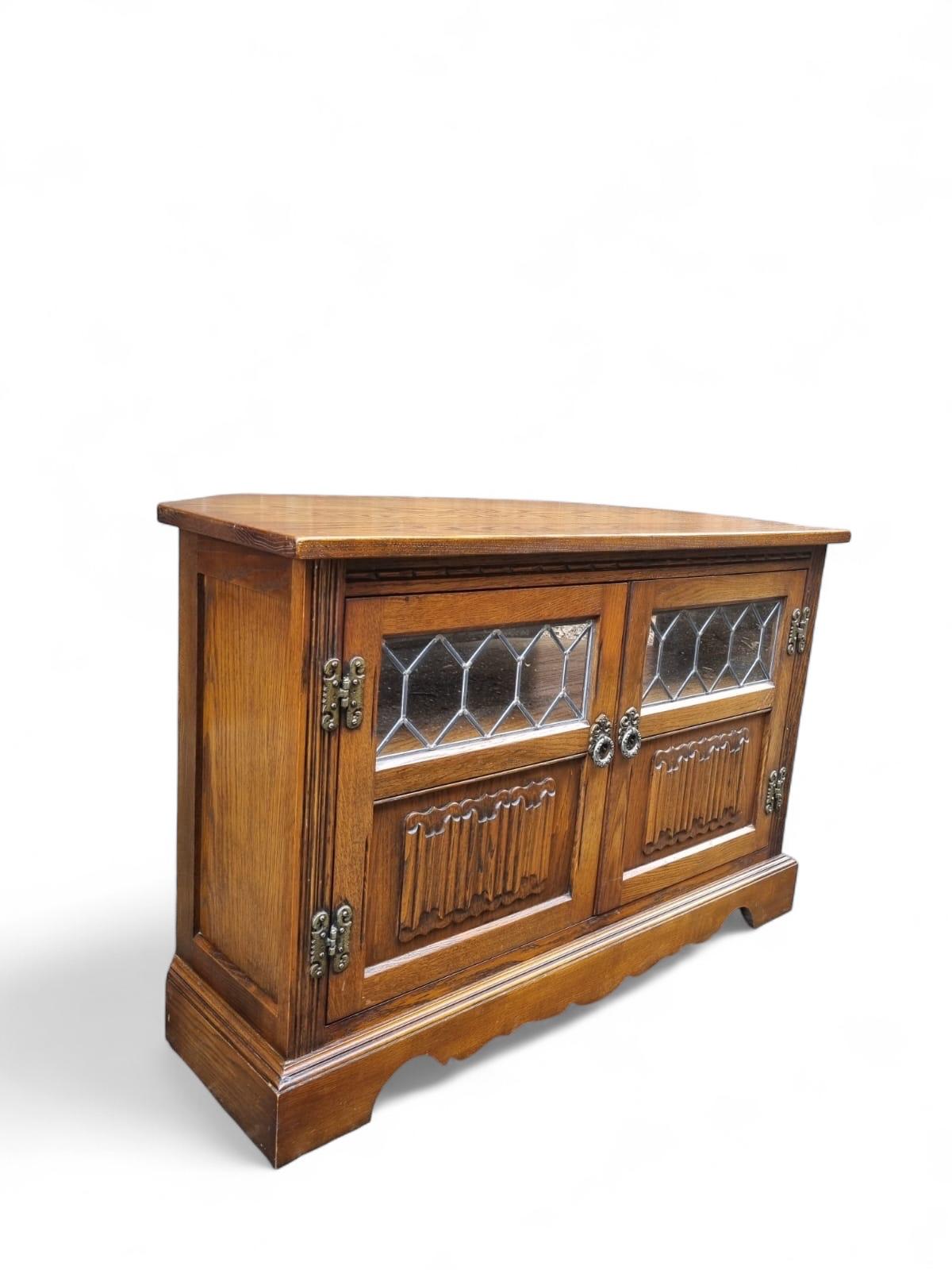Vintage Old Charm Wood Bros / Light Oak Colour / Carved Oak Corner TV Cabinet / Made in England c.1970