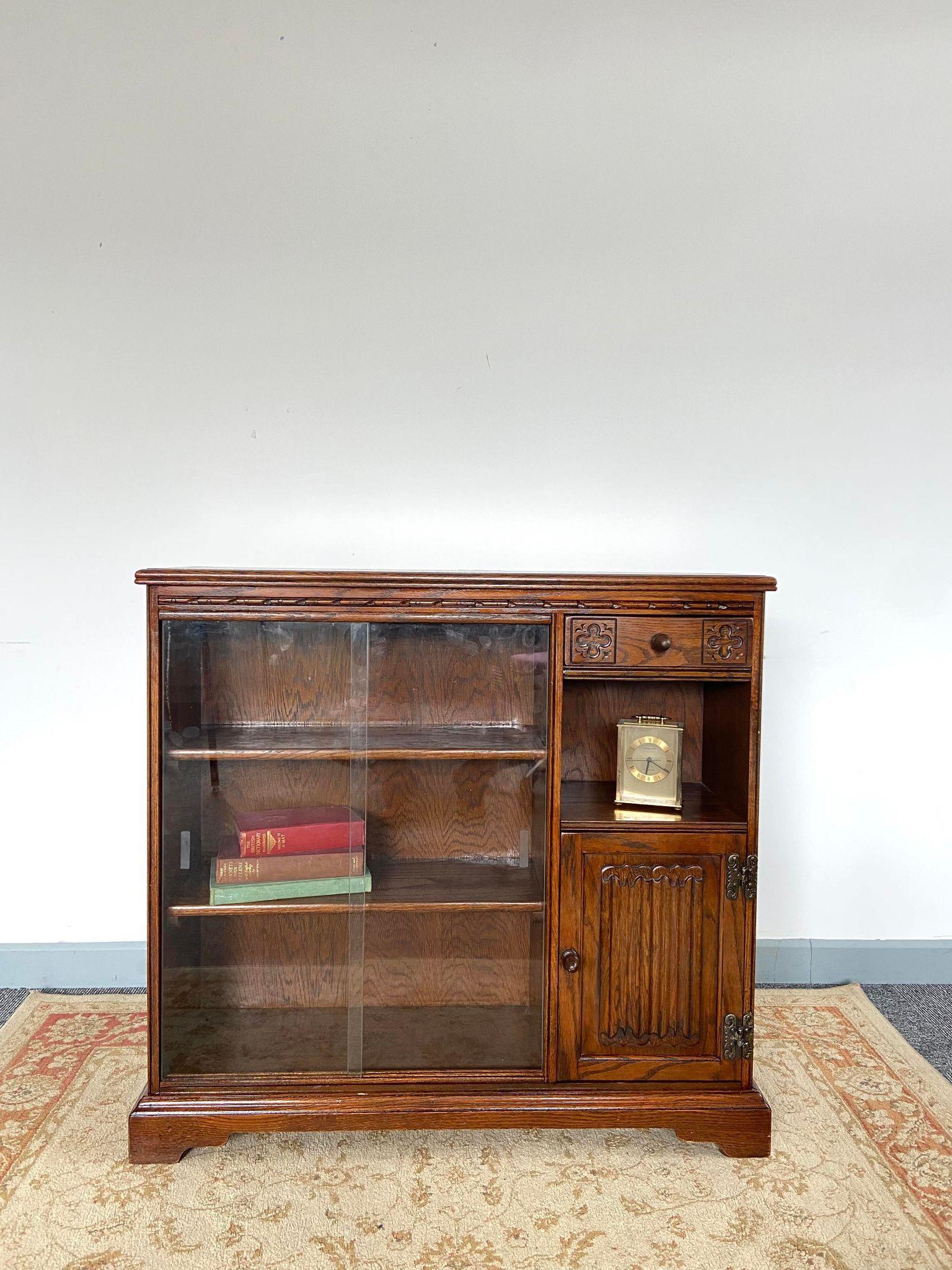 Vintage Old Charm Wood Bros Narrow Hall Bookcase / Glazed Cupboard / Oak Sideboard / Light Oak / Made in England 1960s