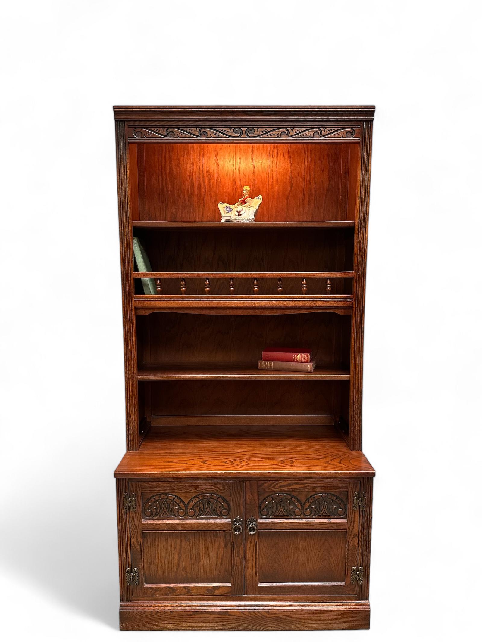 Vintage Old Charm Wood Bros / Two-piece Bookcase-cabinets / Tudor Brown Oak c.1970