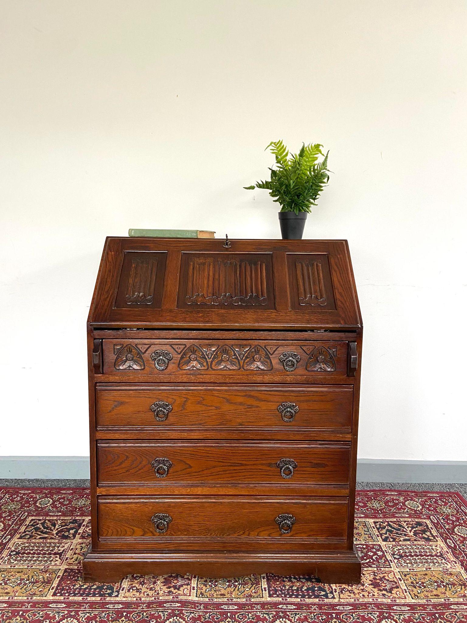 Vintage Old Charm Wood Brothers Bureau Desk With Drawers / Tudor Brown / Made in England 1970s