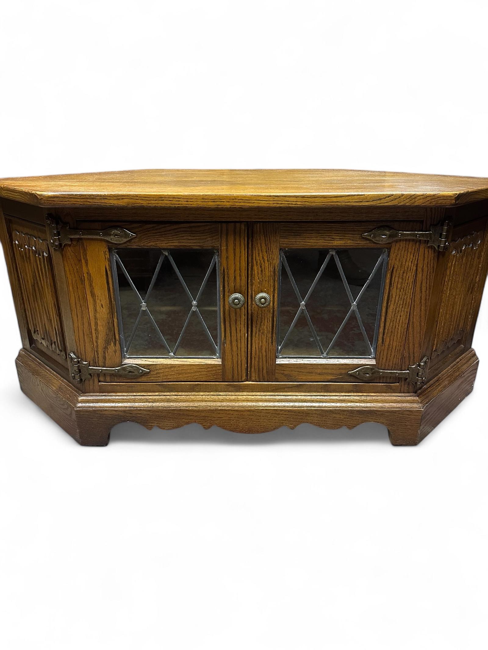 Vintage Old Charm Wood Brothers Carved Corner TV Cabinet 1970s / Traditional Light Oak