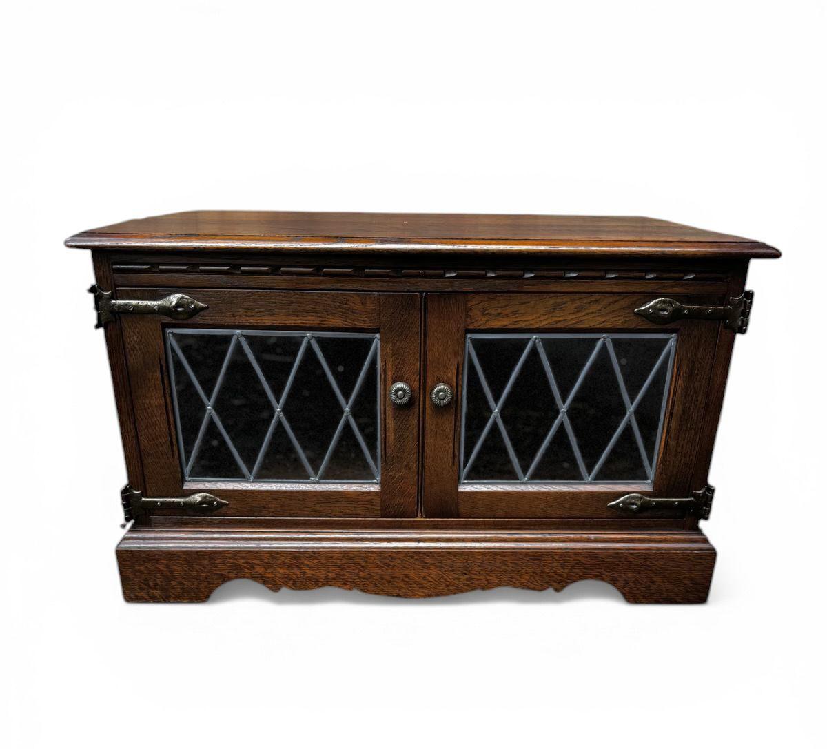 This Vintage Old Charm Wood Brothers / Oak Leaded Glass TV Stand / Tudor Brown Finish is located in Nottinghamshire, United Kingdom
