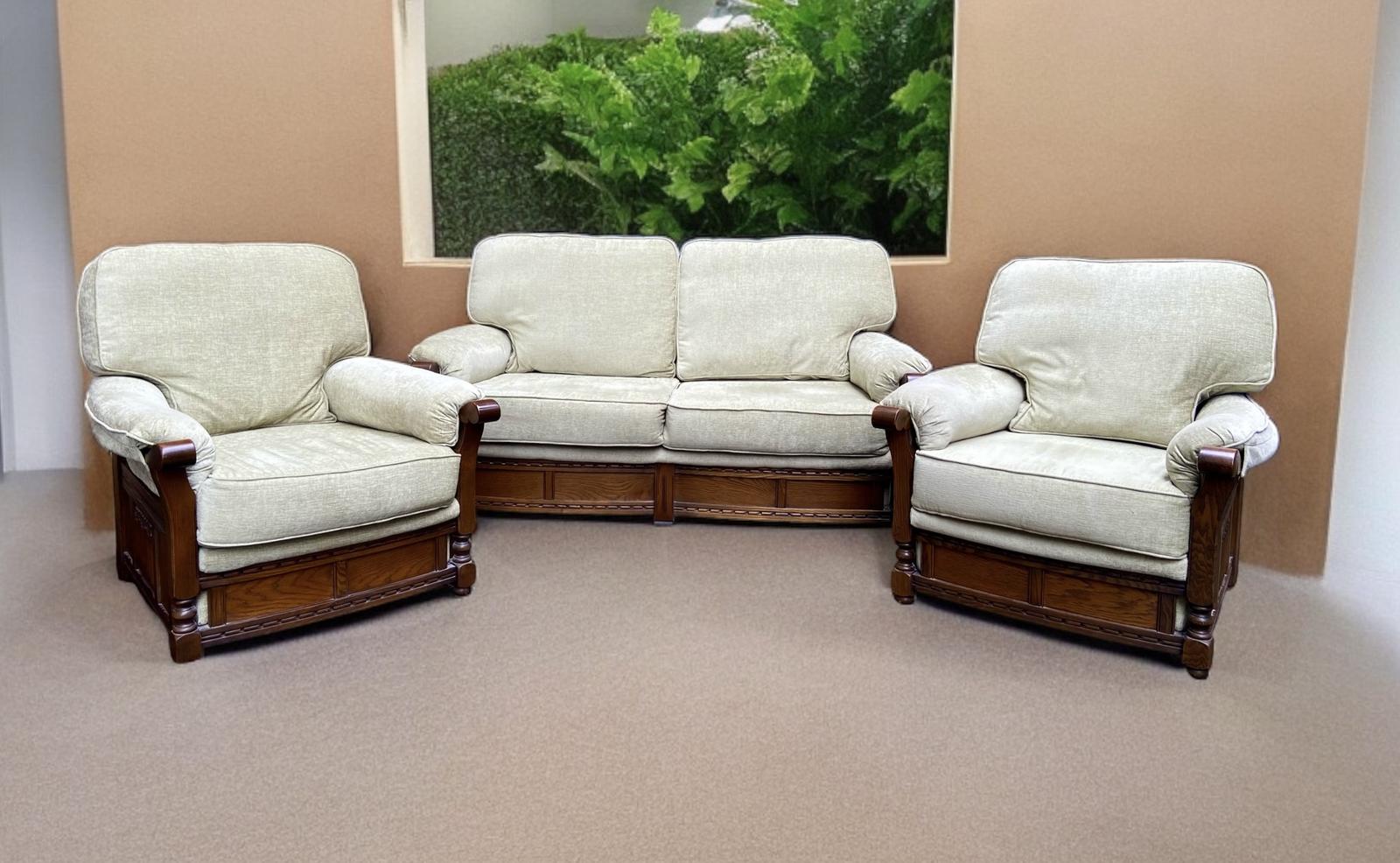 Vintage Old Charm Wood Brothers Sofa & Two Chairs Set / Tudor Brown & Light Green c.1970