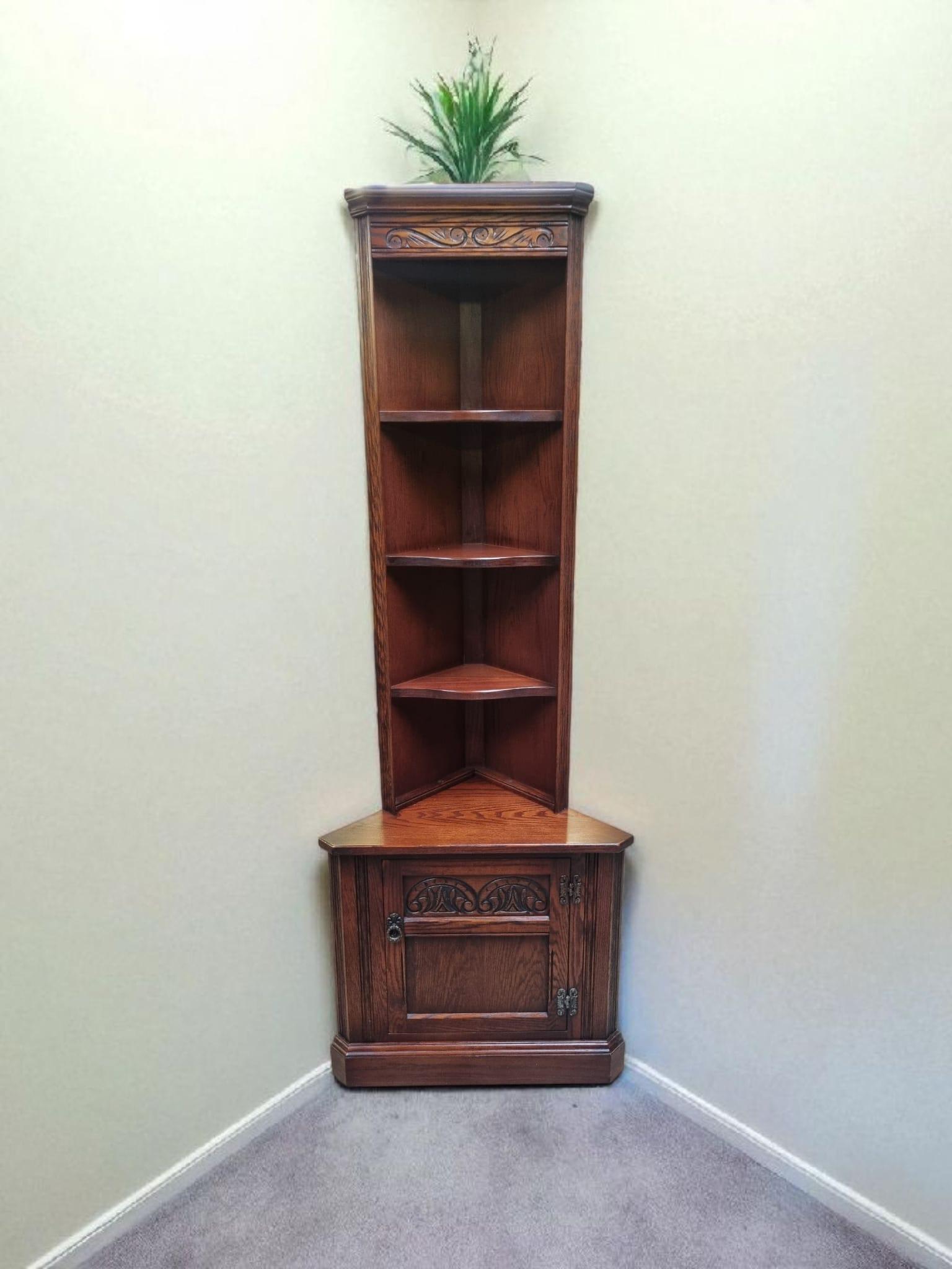 An elegant and finely crafted vintage corner cabinet by Wood Brothers , part of the iconic Old Charm collection. Made in solid oak and finished in the warm Tudor Brown colour, this piece reflects traditional English craftsmanship and design from the 1970s.