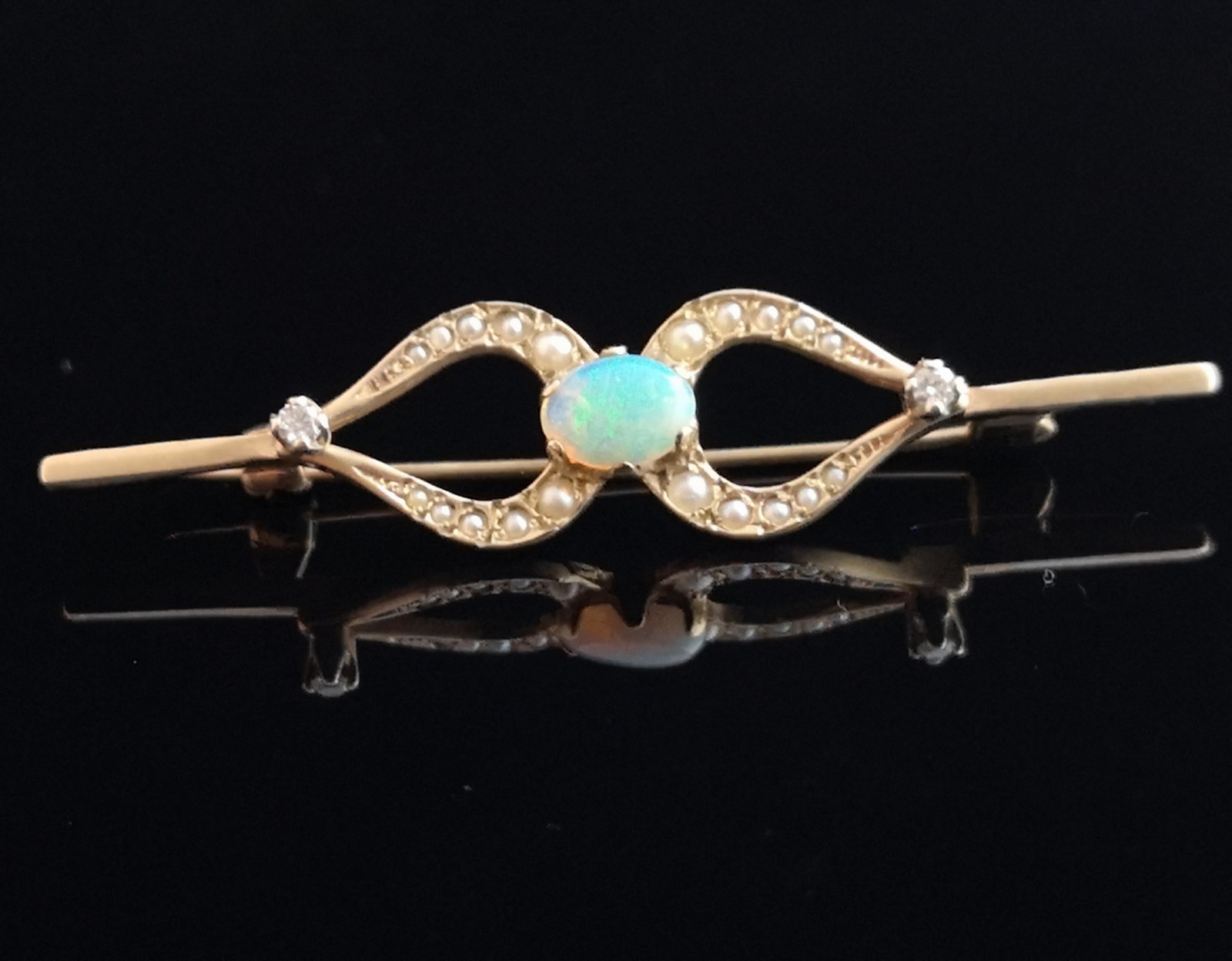Vintage Opal, Diamond & Split Pearl Bar Brooch, 9ct