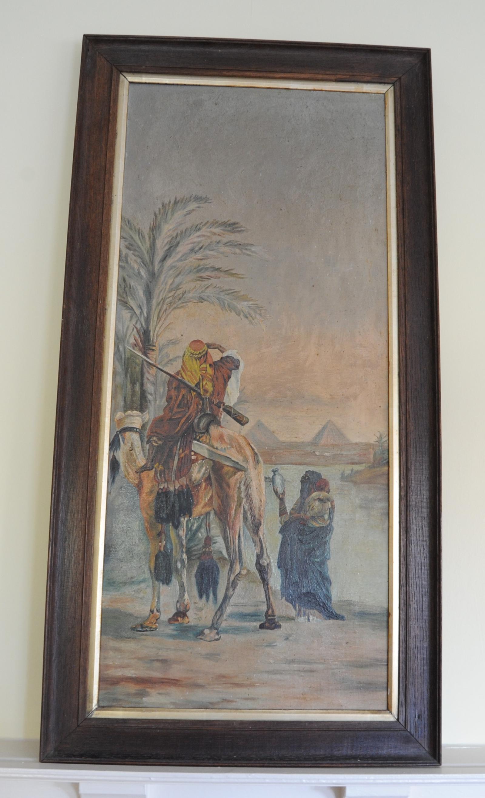 Vintage Orientalist Framed Oil Painting of Camel & Rider in Desert
