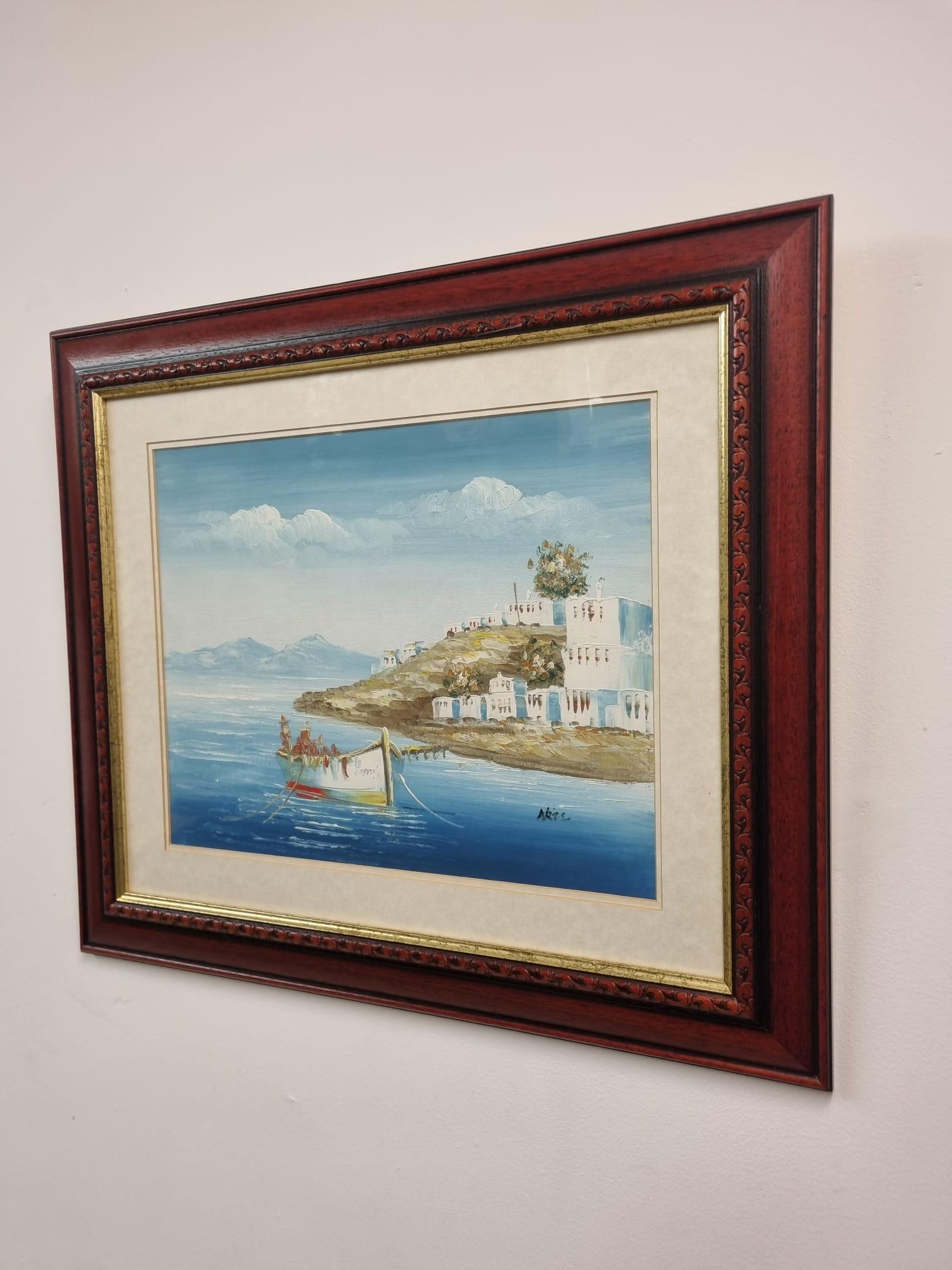 A charming original oil painting on canvas, depicting a peaceful Mediterranean coastal village with a fishing boat in the foreground.