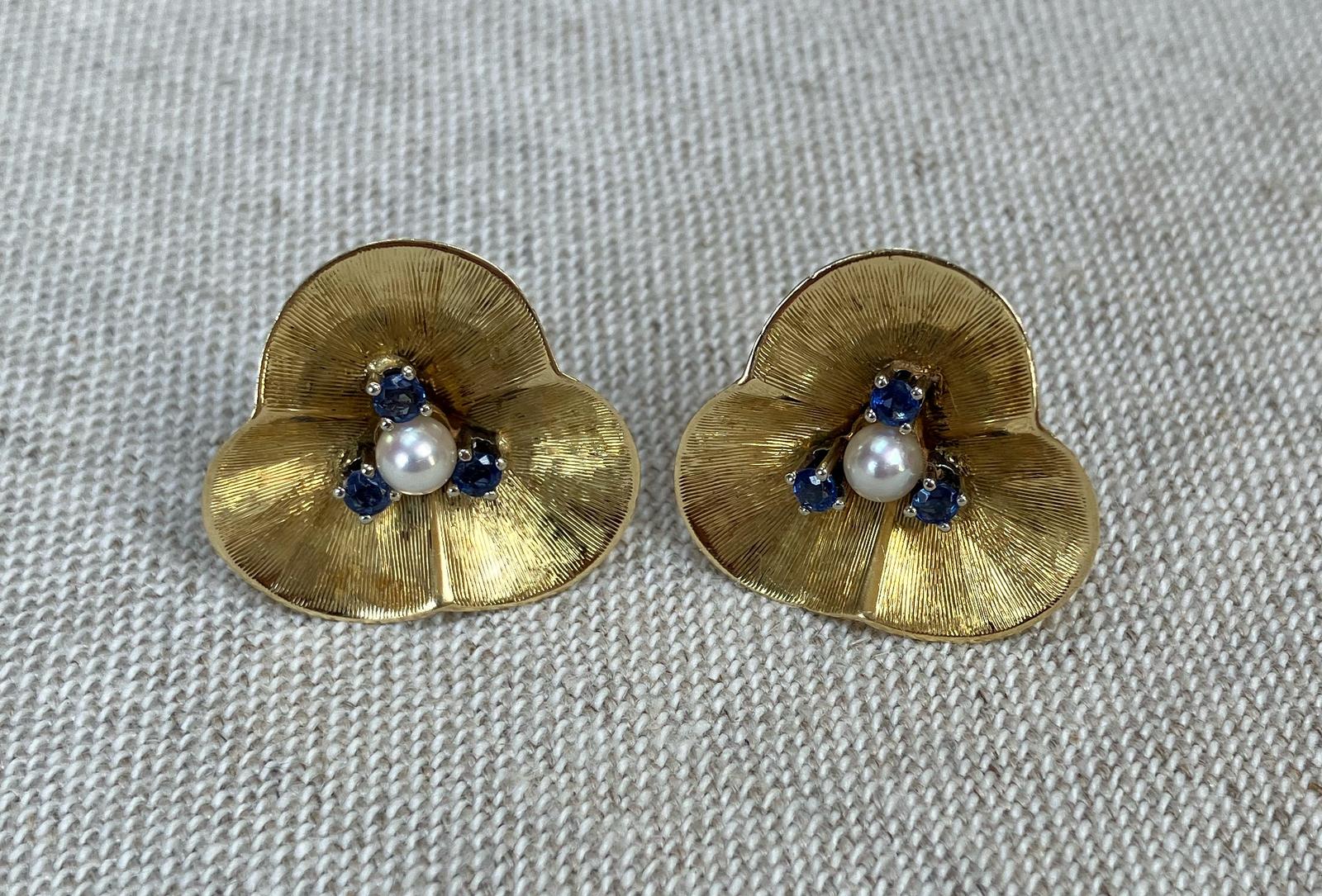 Vintage Pair of 18ct Gold Sapphire & Pearl Flower Shaped Earrings