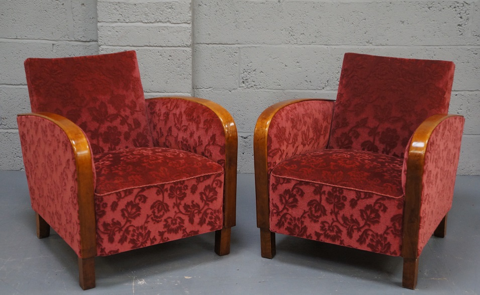 Vintage Pair of Art Deco Birch & Burgundy Upholstered Armchairs