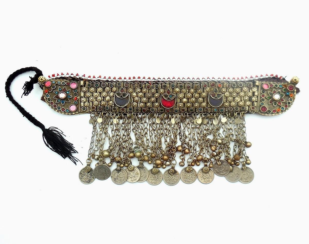 For sale is this attractive dancer's anklet from Pakistan. It is mainly made from silver plated brass and other metals. It is decorated throughout with glass panels, beads, coins, and balls. It makes a satisfying sound when jangled! The anklet was made in the traditional way in the late 20th century. The Pakistani coins appear to date from the 1970s and 1980s. It measures about 30 centimeters between the two clasps. Condition is fair with some minor bead and glass losses. One of the clasps has broken and needs repair. Some of the protective fabric is coming away from the metal belt. Some minor scratching and wear from handling over time. It is a nice anklet which would suit a belly dancer or even a young lady as it is very decorative.