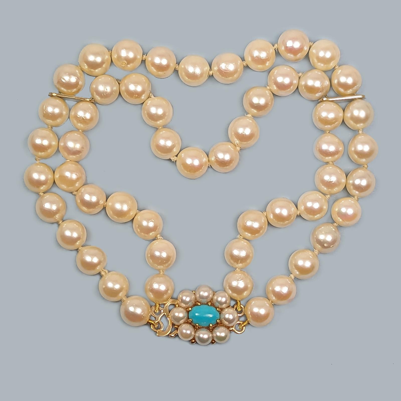 Vintage Pearl Bracelet with Turquoise 9ct Gold Cluster Clasp 1960s Double Strand