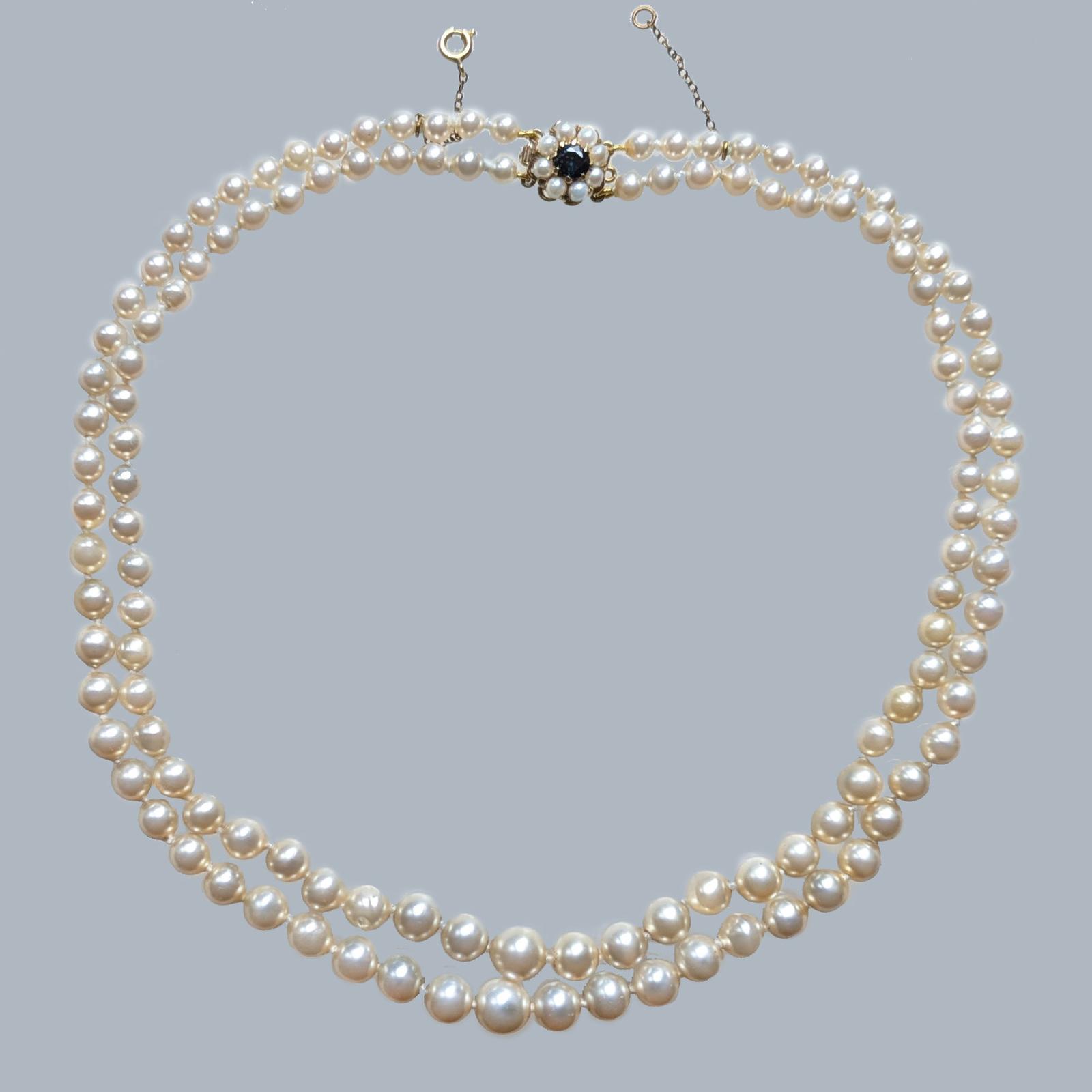 Vintage Pearl Necklace 9ct Gold Floral Sapphire Clasp Double Strand London 1966