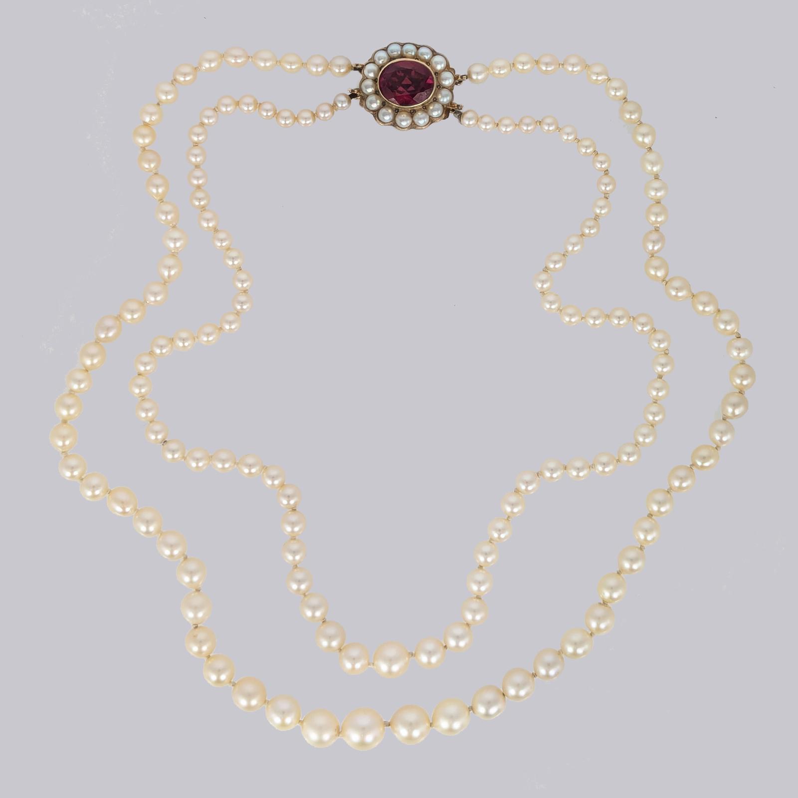 Vintage Pearl Necklace Double / Single Strand with 9ct Gold Floral Garnet Clasp