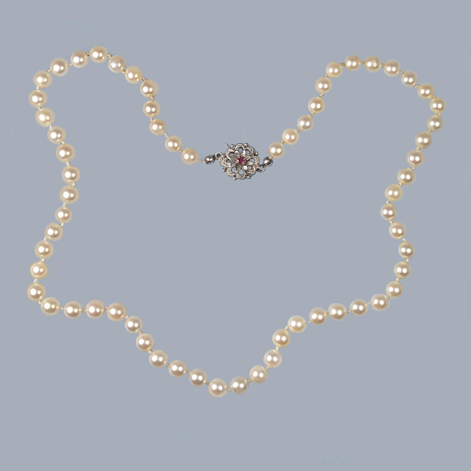 Vintage Pearl Necklace Ruby Floral Clasp 18ct Gold Single Strand Pearls Circa 1970s