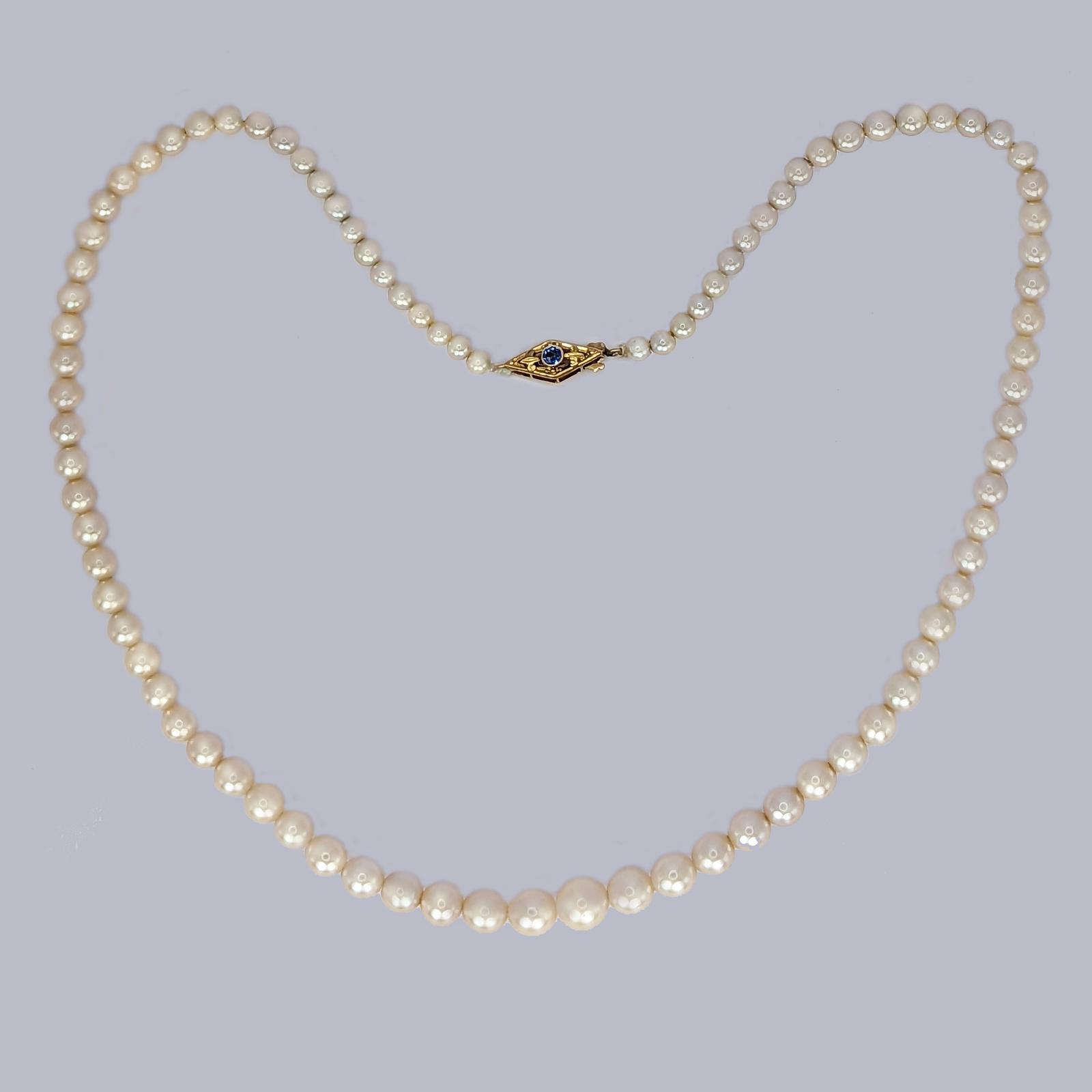 Vintage Pearl Necklace Sapphire Clasp 9ct Gold 1950s Graduating Single Strand