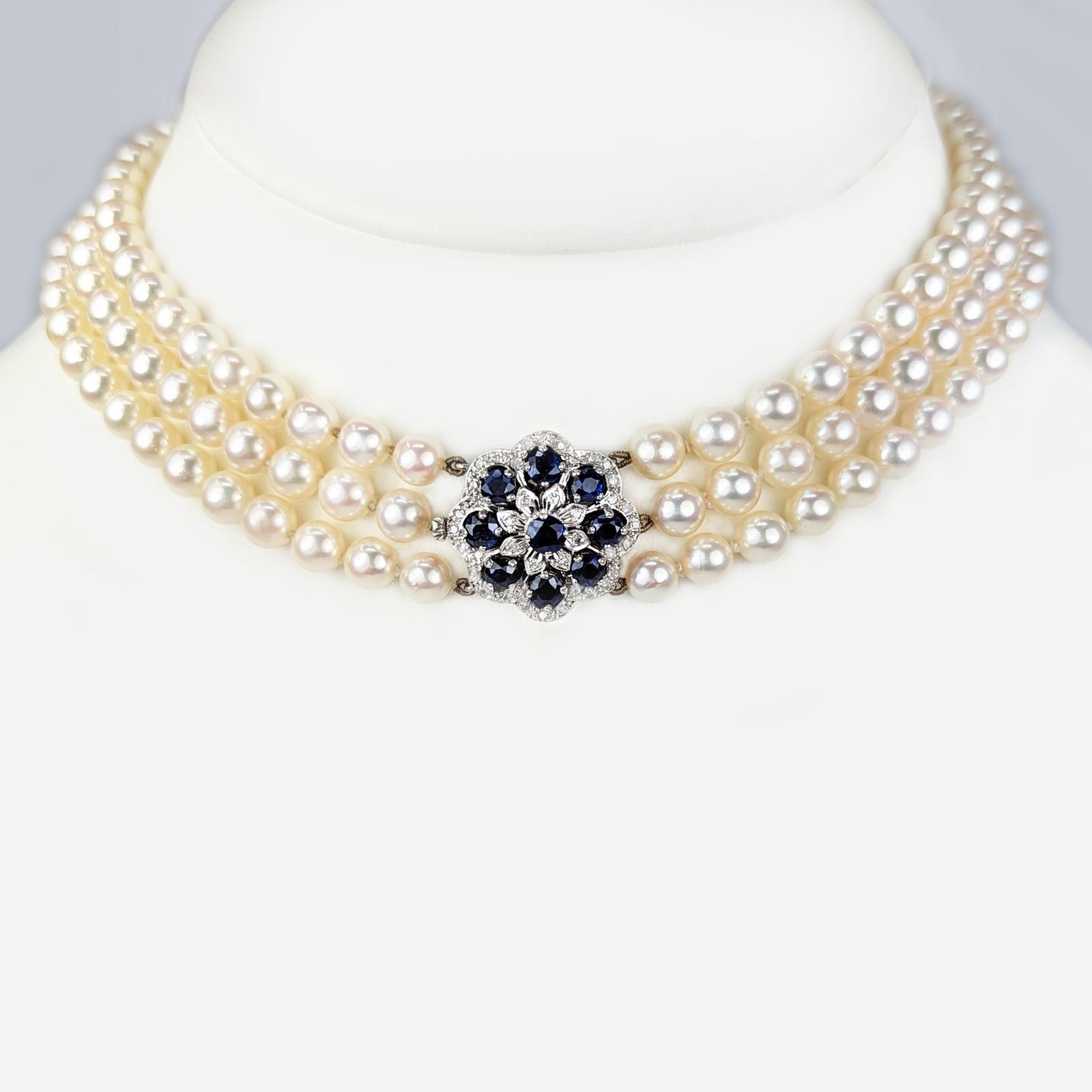 Vintage Pearl Necklace Sapphire & Diamond Clasp 9ct Gold 1984 Triple Strand